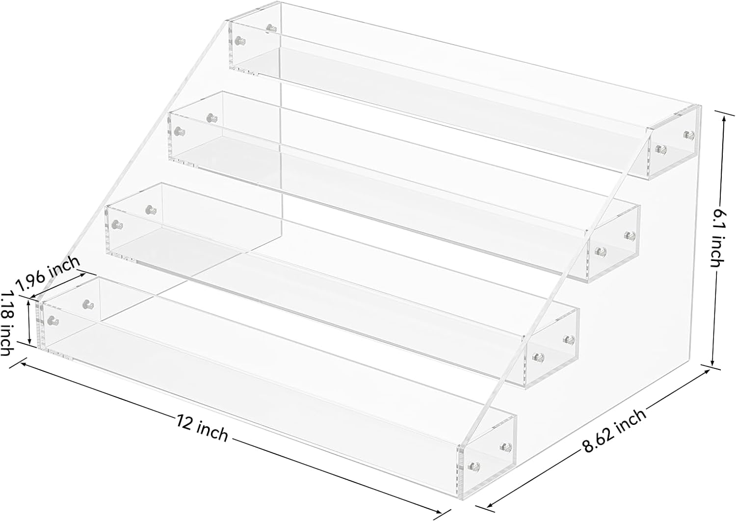 - 【Wide Use】: This acrylic display riser can create a floating visual effect, it makes your items more attractive. The 4-tier display shelf can better store your items, it makes the cakes, candies and desserts displayed at the party more sparkling. It is suitable for perfume, lotion, snacks, nail polish, kitchen spice, essential oil and jewelry.