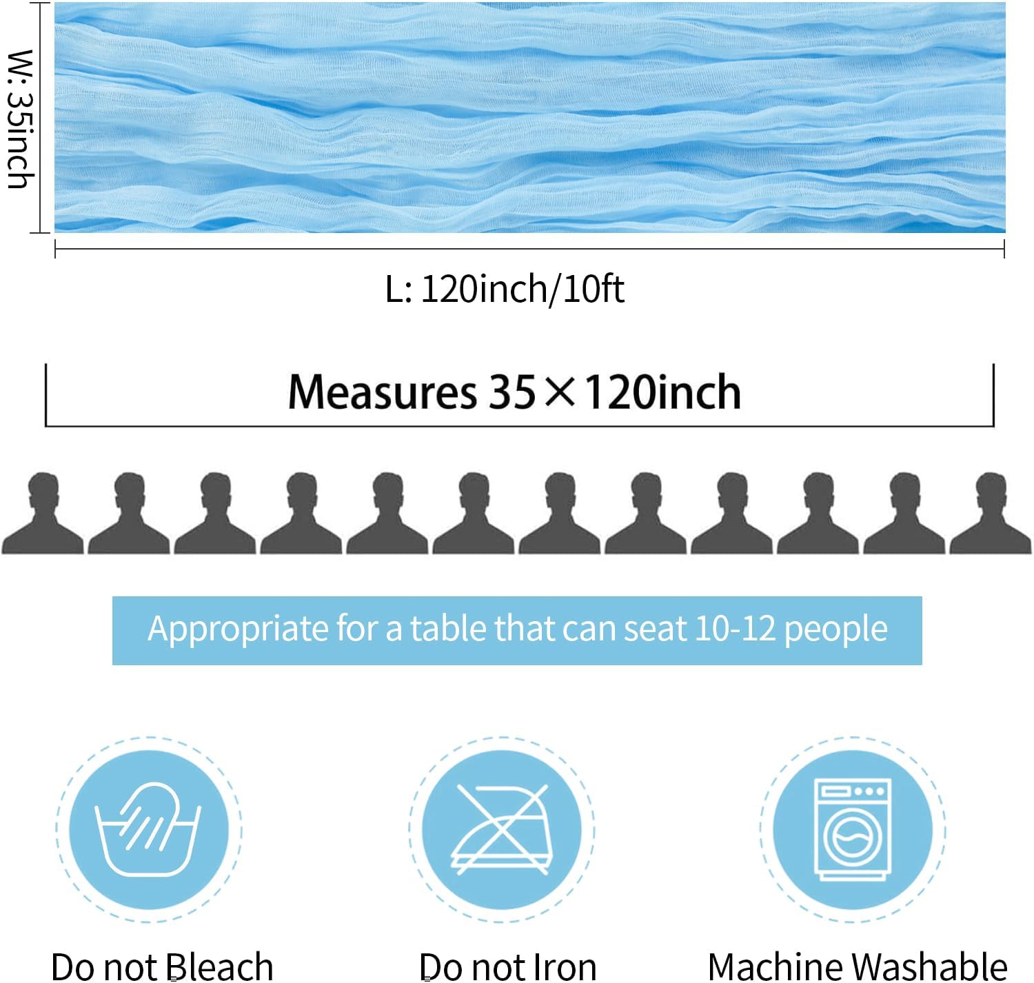 - đăCute Baby Blue Cheese Cloth Table RunnerăSet of 3 baby blue cheesecloth gauze table runners. Each boho table runner is 35" W x 120" L, a perfect length for a 6ft/ 8ft round or rectangle table that can accommodate 8-10 people.It can also be spliced together for long tables. A simple and easy way to dress up a table as wrinkled design no ironing is required & they add a soft touch to your decor! The light blue gauze table runners can be compressed, lightweight, and compact, easy to store, more space-saving.