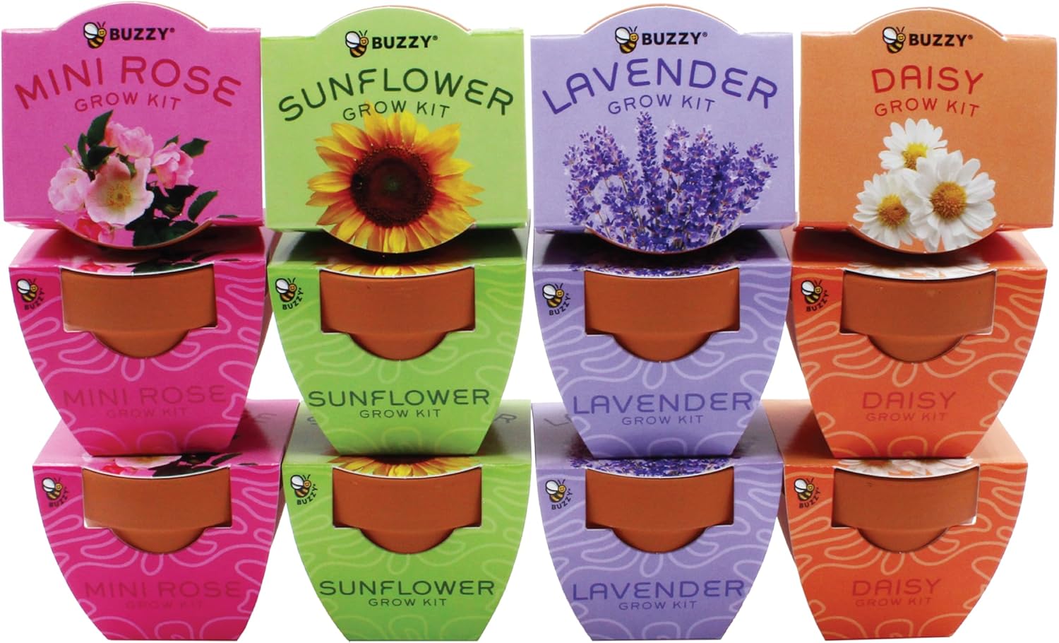 BUZZY Seeds Terracotta Mini Grow Pots | Flower Starter Kit for Kids & Adults | Assorted 12-Pack, Bright Series Collection, Daisy, Lavender, Mini Rose, Sunflower | Gardening Gift, Party Favors
