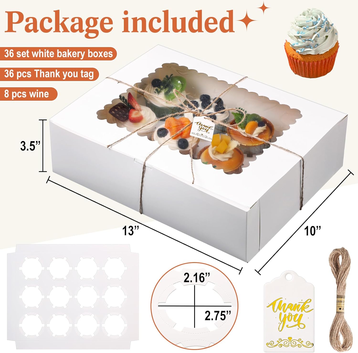 - Value Cupcake Boxes: you will receive 36 white cupcake boxes with windows and inserts; Each cupcake holder can hold 12 standard cupcakes, and comes with 8 jute ropes totaling 80 meters (8 rolls X 10 meters) and 36 "Thank You" cards, which can ideal display your baking works and gift-giving needs