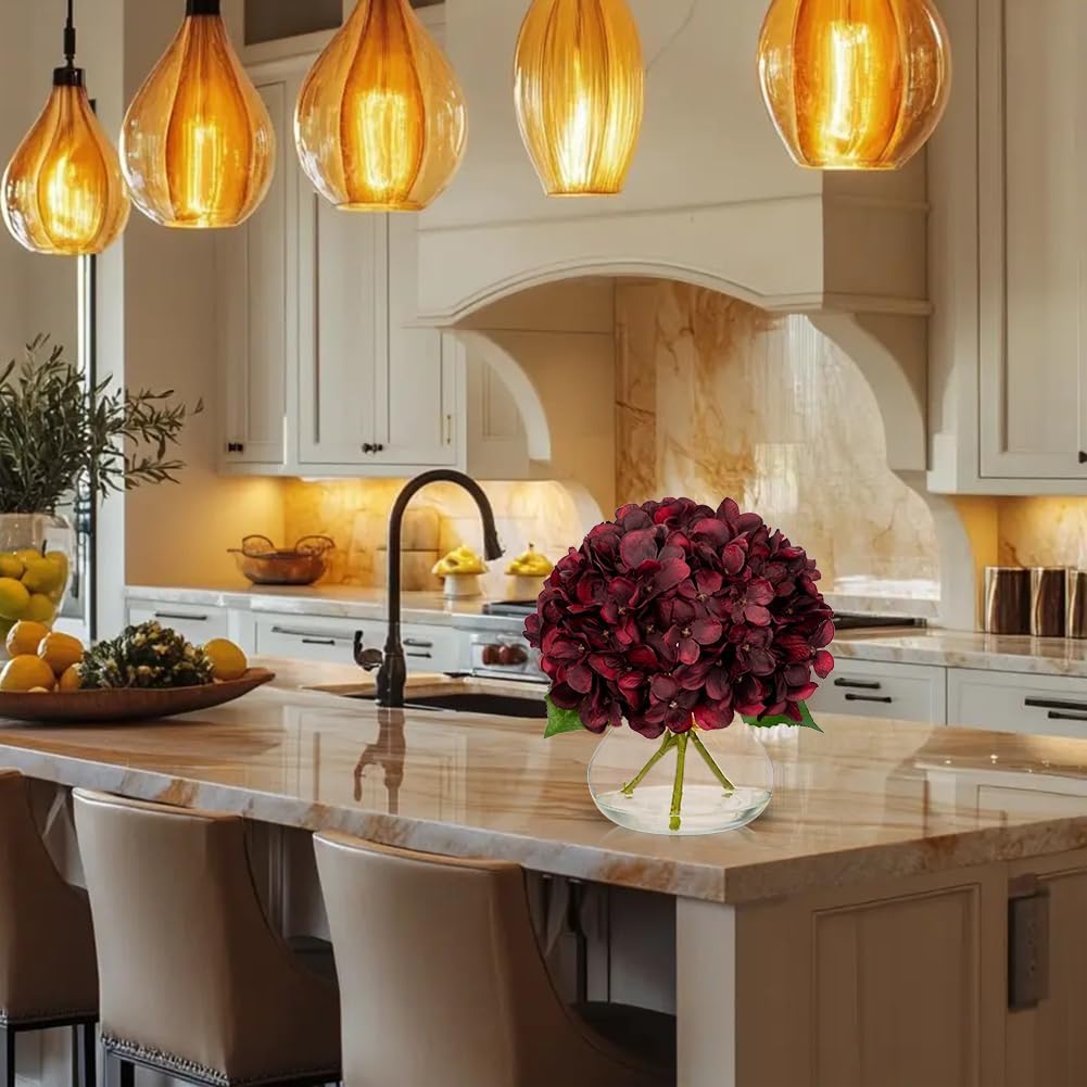 Hollyone Dark Red Fall Hydrangea Artificial Flowers for Decoration in Glass Vase Autumn Silk Faux Flower Arrangements with Faux Water Table Centerpiece Vase with Fake Flowers Fall Decorations for Home
