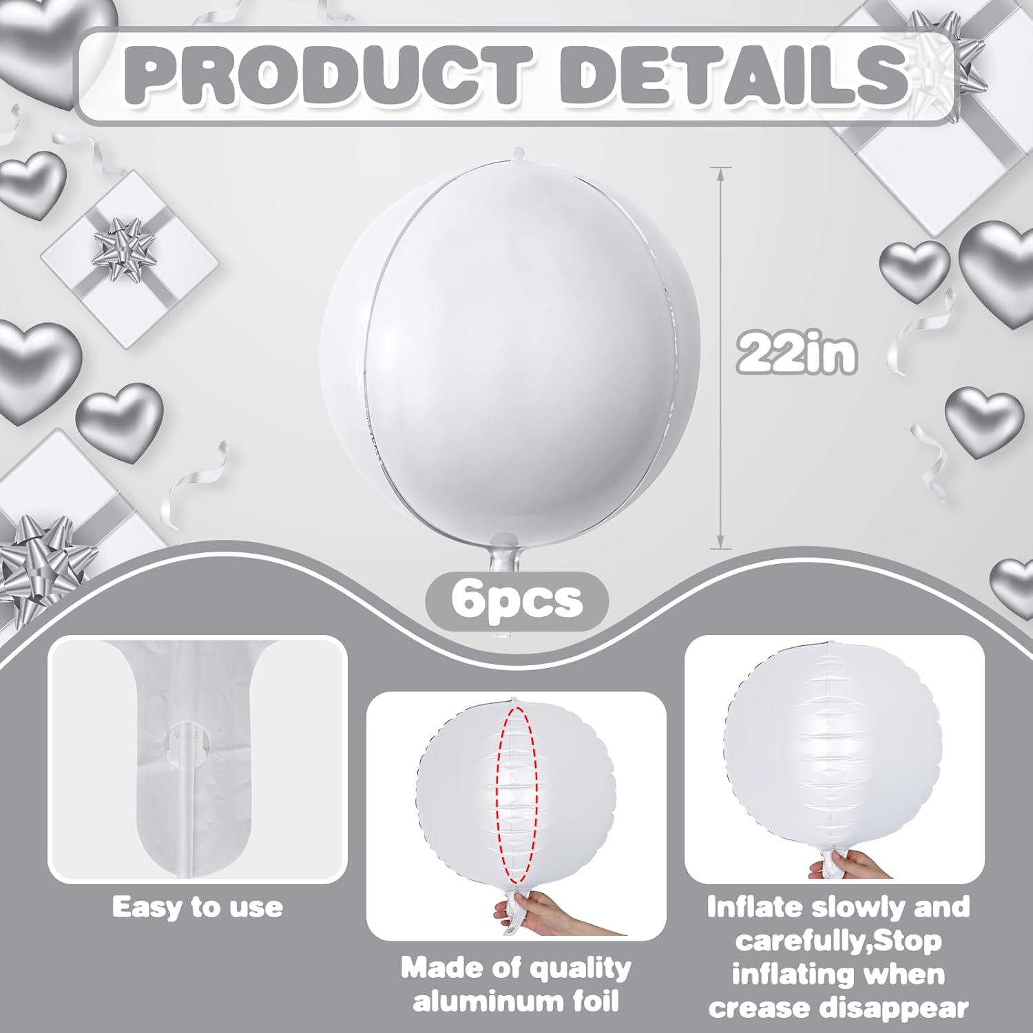 - ă6PCS ROUND BALLOONSăpackage include 6pcs 22inch white round giant 4D foil balloons. The white round balloons are large enough to help you better decorate your party.