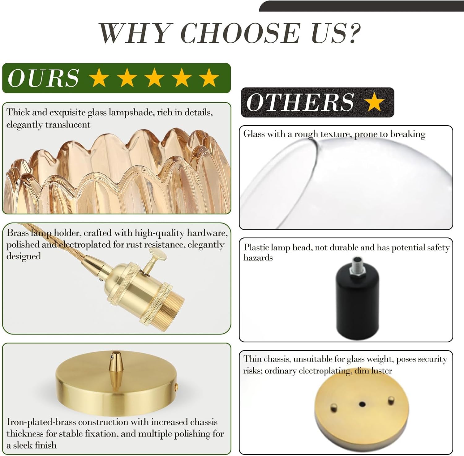 - 【Tulip Glass Shade】 The delicate tulip - shaped amber glass shade diffuses light beautifully, adding a touch of sophistication to any room. It's a key feature that makes this pendant light stand out as a stylish lighting option for bedrooms, dining rooms, and more