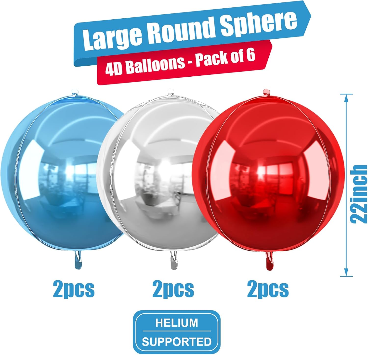 - Package: You will receive 6pcs 22inch 4D round foil balloon, 2pcs red foil balloons + 2pcs blue foil balloons + 2pcs silver foil balloons+ 1 straw + 1 roll of ribbon. 4D birthday balloons perfect for decorating the babies, kids, adults’ birthday party.