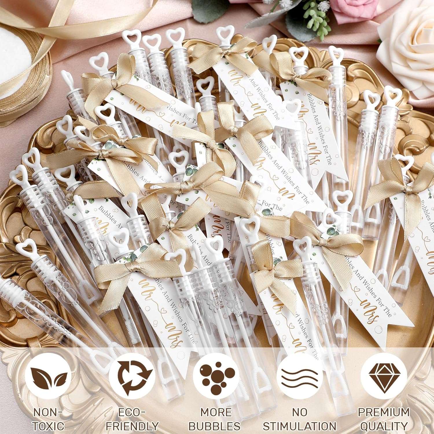 - Wedding Send off Bubbles: the wedding bubbles set contains 200 white heart mini bubble wands, 200 gift tags, 1 bubble send off display card, 1 wood color photo frame and 3 rolls of champagne gold ribbon, nice for wedding party favors and wedding farewell bubbles