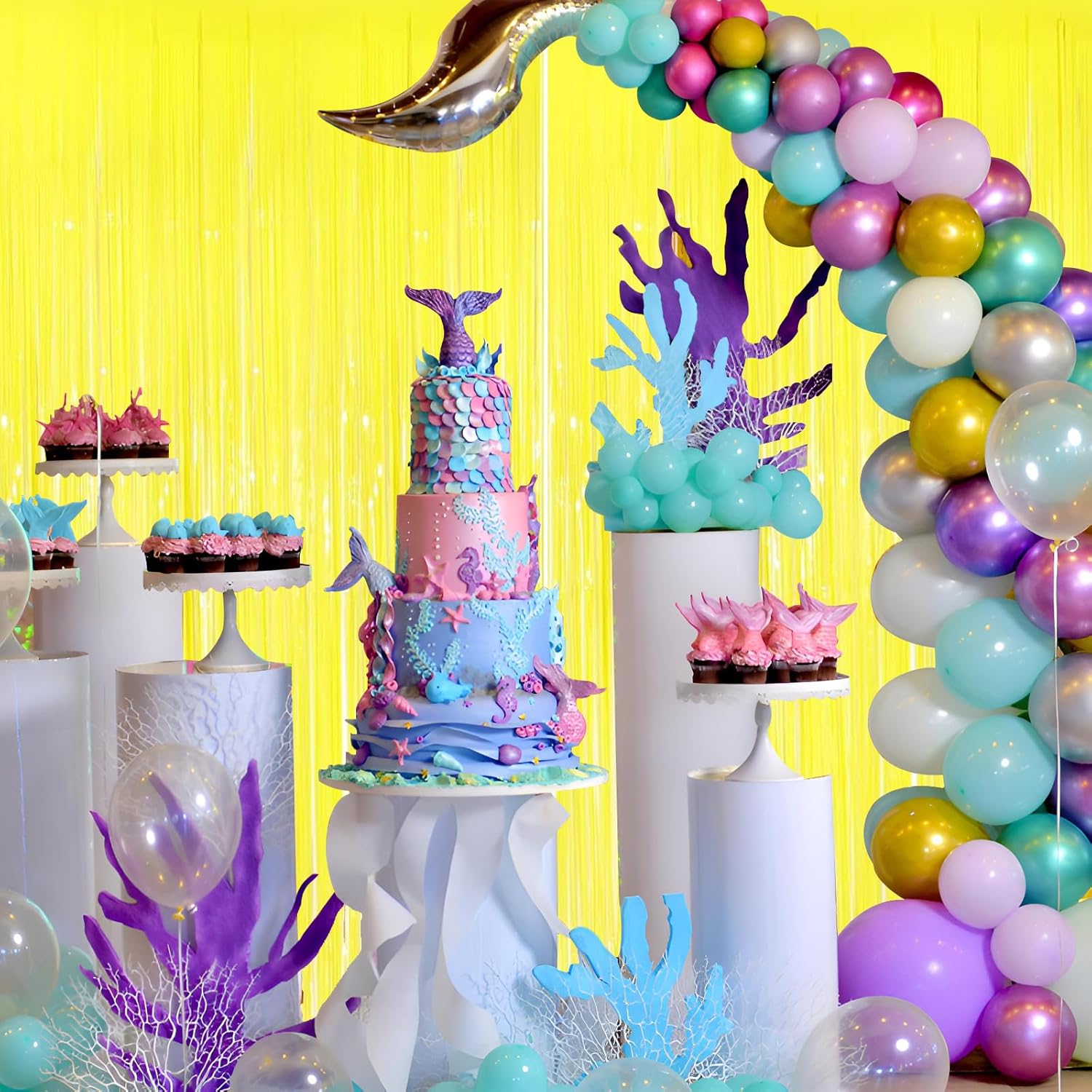 - Pair with other party decorations: Tinsel backdrop curtain can be paired with LED lights, balloons, banners, wreath, garlands, swirl streamer, tissue paper pom poms.