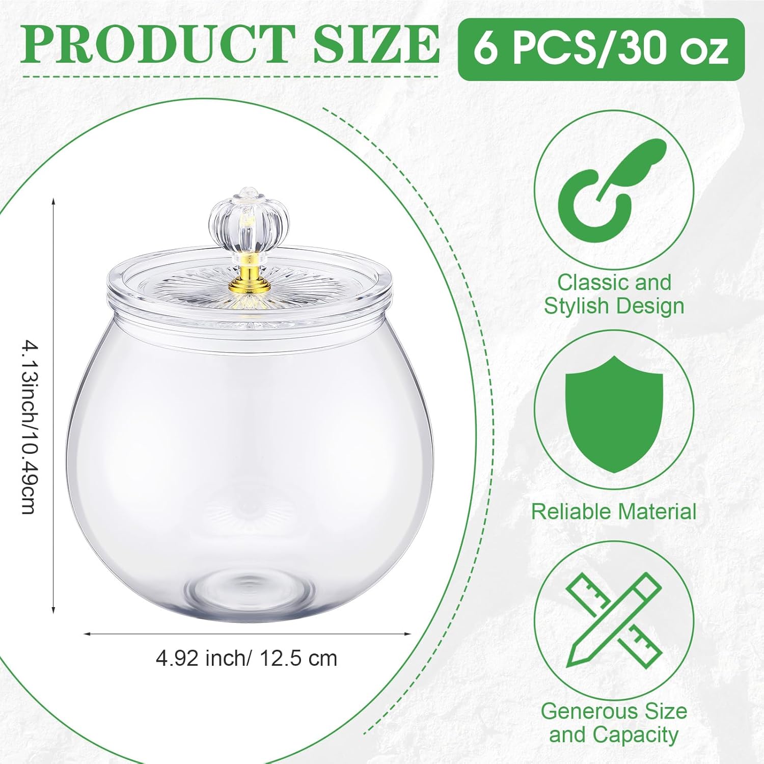 - Package Content: this pack includes 6 clear jars with lids; Each candy storage jar comes with a lid, making it ideal for those who frequently bake or entertain; The pack efficiently accommodates assorted goodies, enough quantity to meet your various requirements; Note: this product is made of plastic; Please confirm the material before purchasing