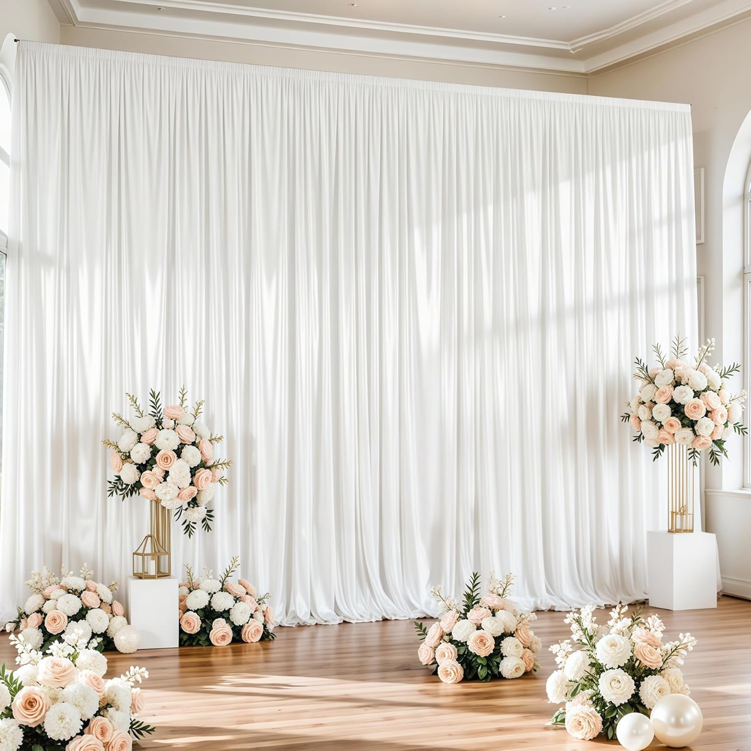- Set of 10X10ft White Shiny Curtain Backdrop: 2 panels of glitter white curtains for backdrop stand, 5 feet (W) and 10 feet (H) each, for a total of 10 feet (W) and 10 feet (H), the silk polyester panels can create a stunning layered or draped effect, unique and versatile backdrops that elevate photo shoots