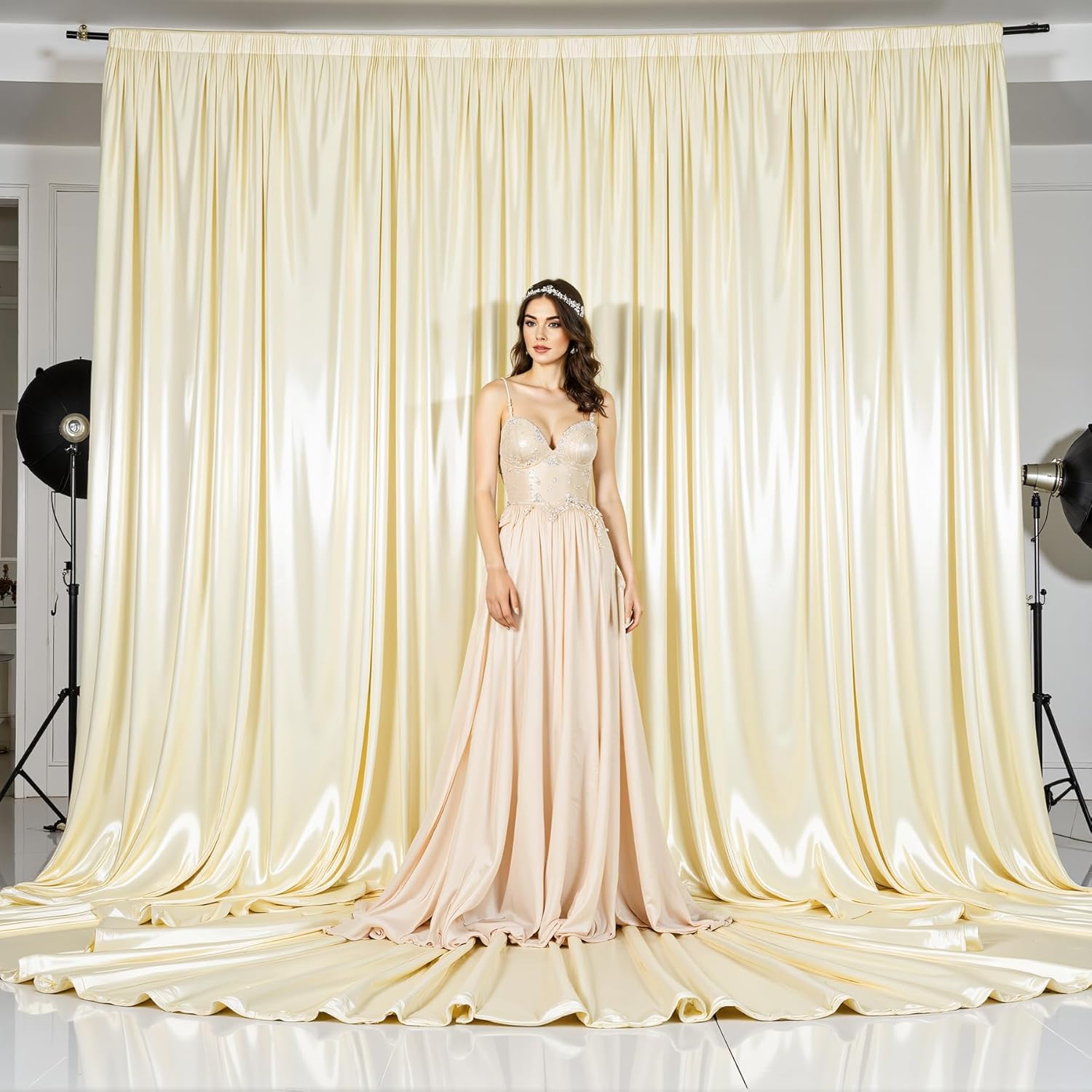 - Set of 10X10ft Champagne Shiny Curtain Backdrop: 2 panels of glitter champagne curtains for backdrop stand, 5 feet (W) and 10 feet (H) each, for a total of 10 feet (W) and 10 feet (H), the silk polyester panels can create a stunning layered or draped effect, unique and versatile backdrops that elevate photo shoots