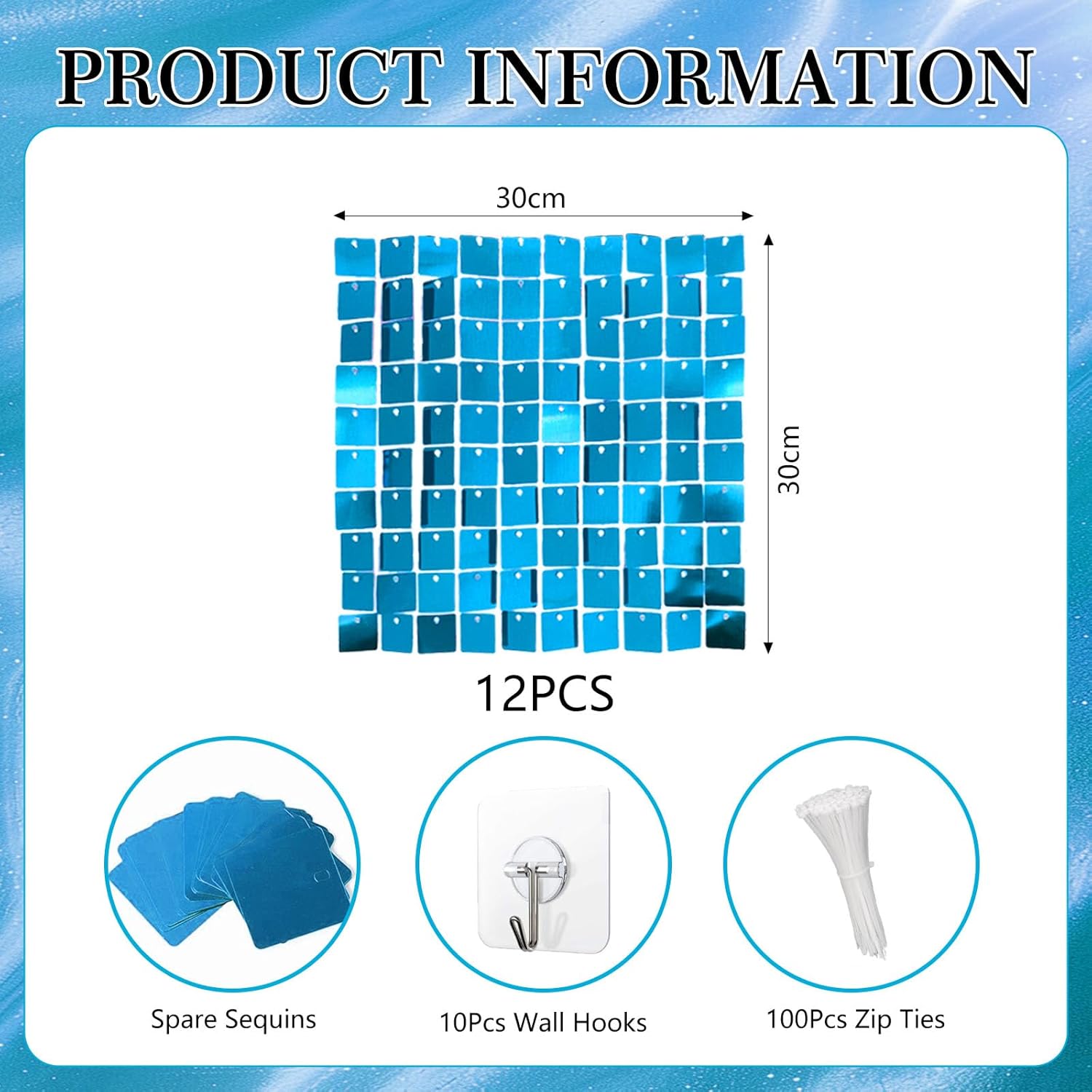 12PCS Lake Blue Shimmer Wall Backdrop, Square Sequin Photo Backdrops Panel, Glitter Wall Background for Birthdays, Weddings, Graduation, Baby Showers, Disco Bachelorette Party Decoration (3FTx4FT)