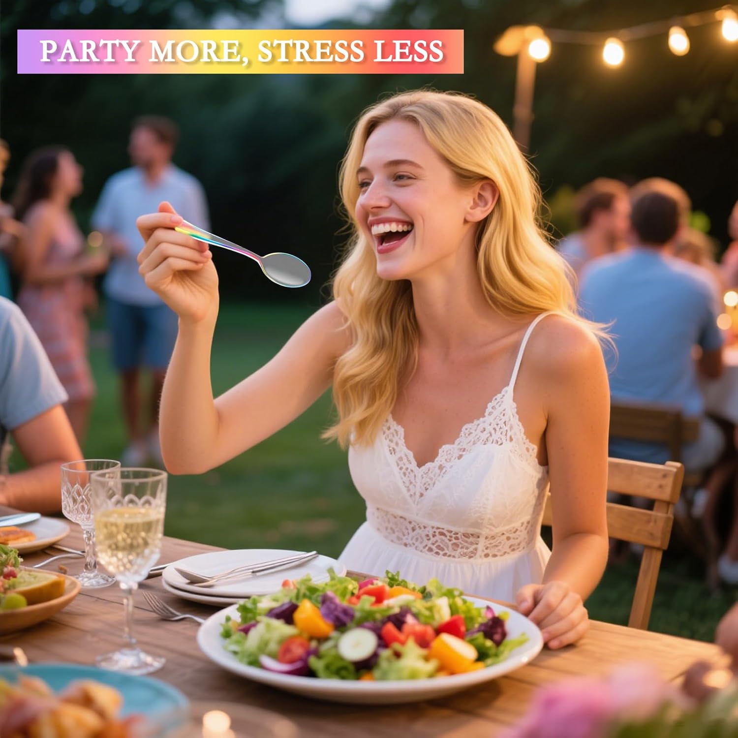 - Quality and Timely After-Sales Service: Backed by certification and strict quality control, our plastic cutlery set guarantees durability and consistency across every piece. We offer a 100% refund policy for damaged or missing items, ensuring your complete confidence in every purchase. Each rainbow silverware set withstand the rigors of large events while maintaining its stunning appearance.