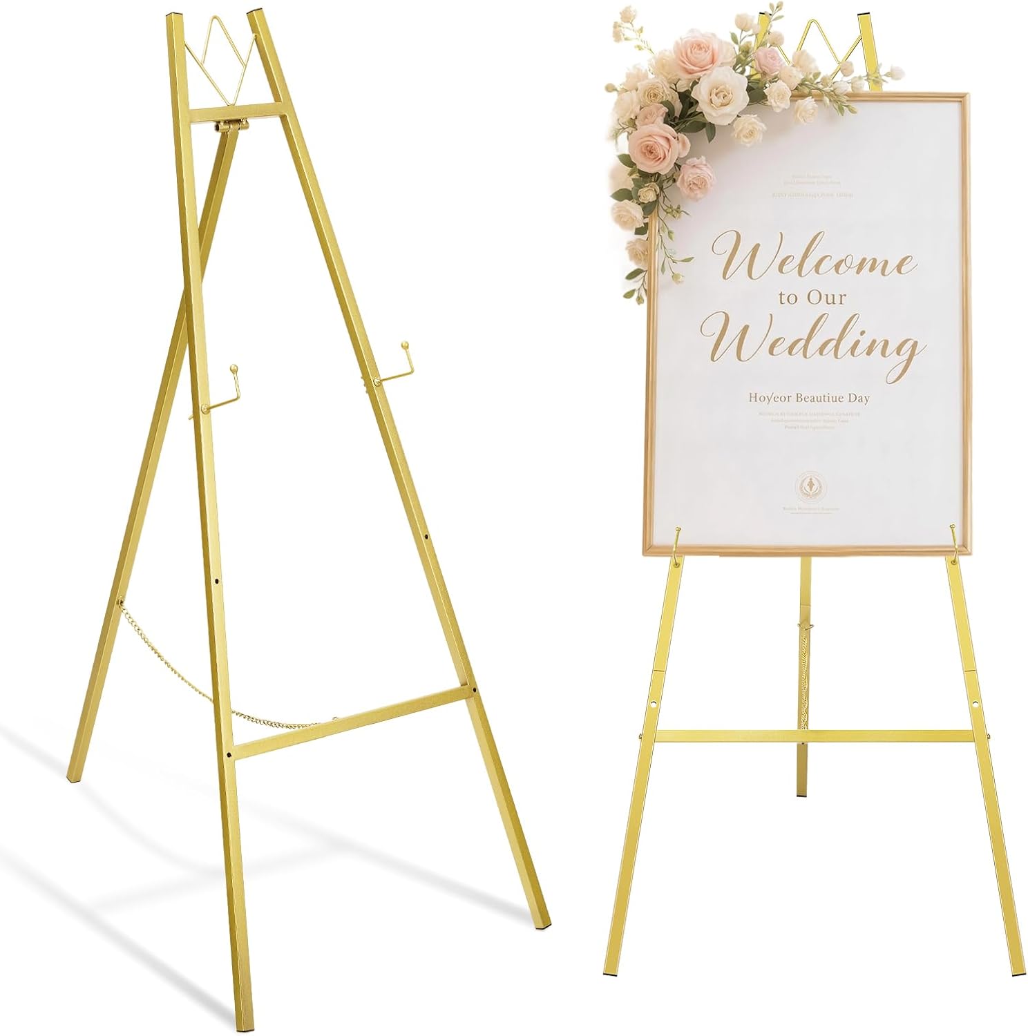 GRENTY 46.7" Gold Easel Stand for Wedding Signs – No Assembly Needed, Heavy Duty Metal Display Stand for Art, Welcome Signs, Posters, Pictures, Paintings, and Floor Décor