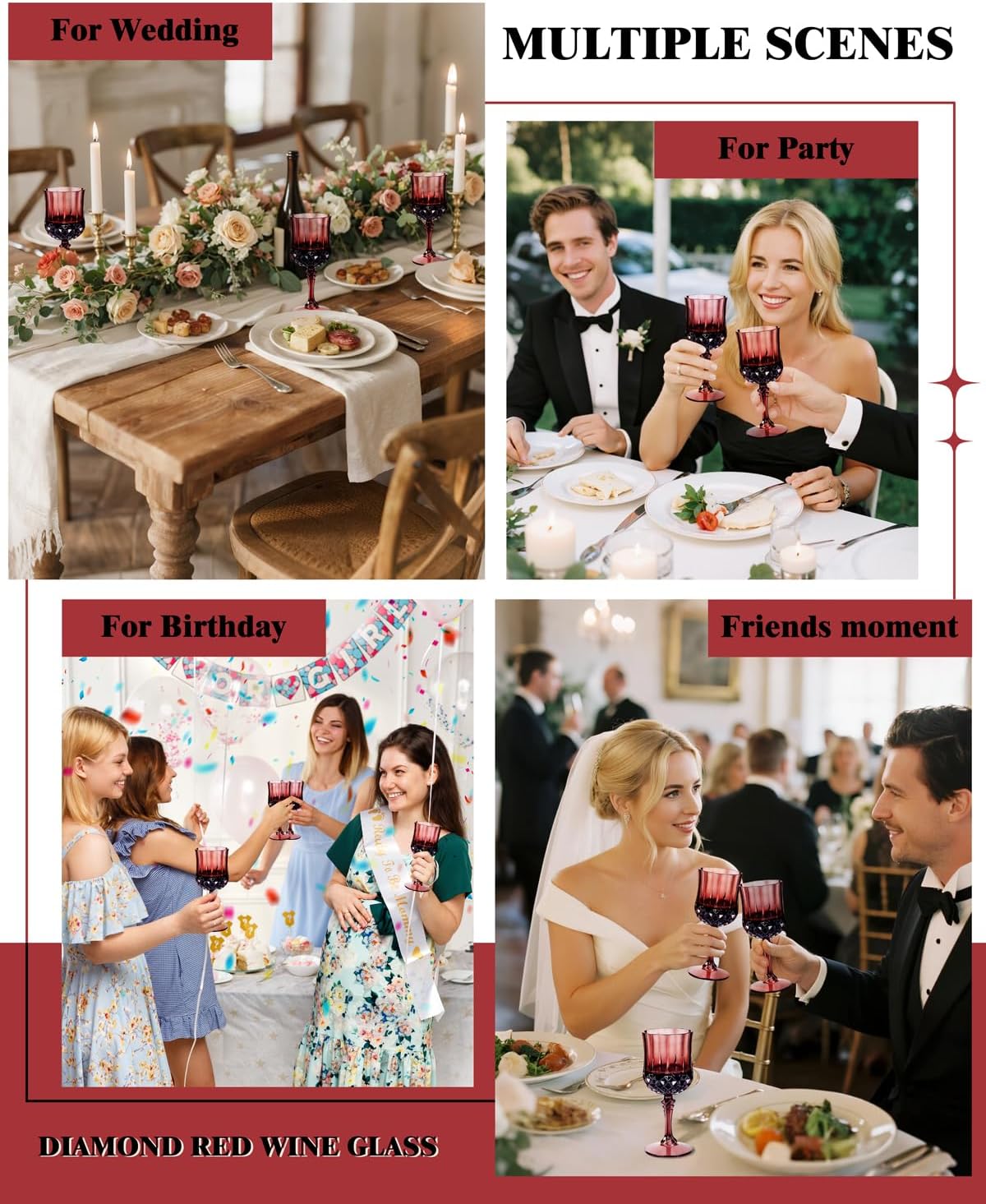 - Retro diamond-shaped pattern design: Imitating real crystal, plastic wine glasses have the charm of a vintage wine glass. Plastic wine glasses disposable’s retro design enriches the modern and classic dining table setting with an elegant atmosphere.