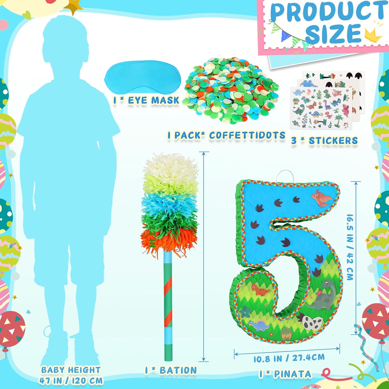 - Happy Birthday Piñata Set: Dinosaur-themed number 5 piñata, perfect for adventurous party decorations. Complete with fabric blindfold, baton, dinosaur-themed confetti and stickers