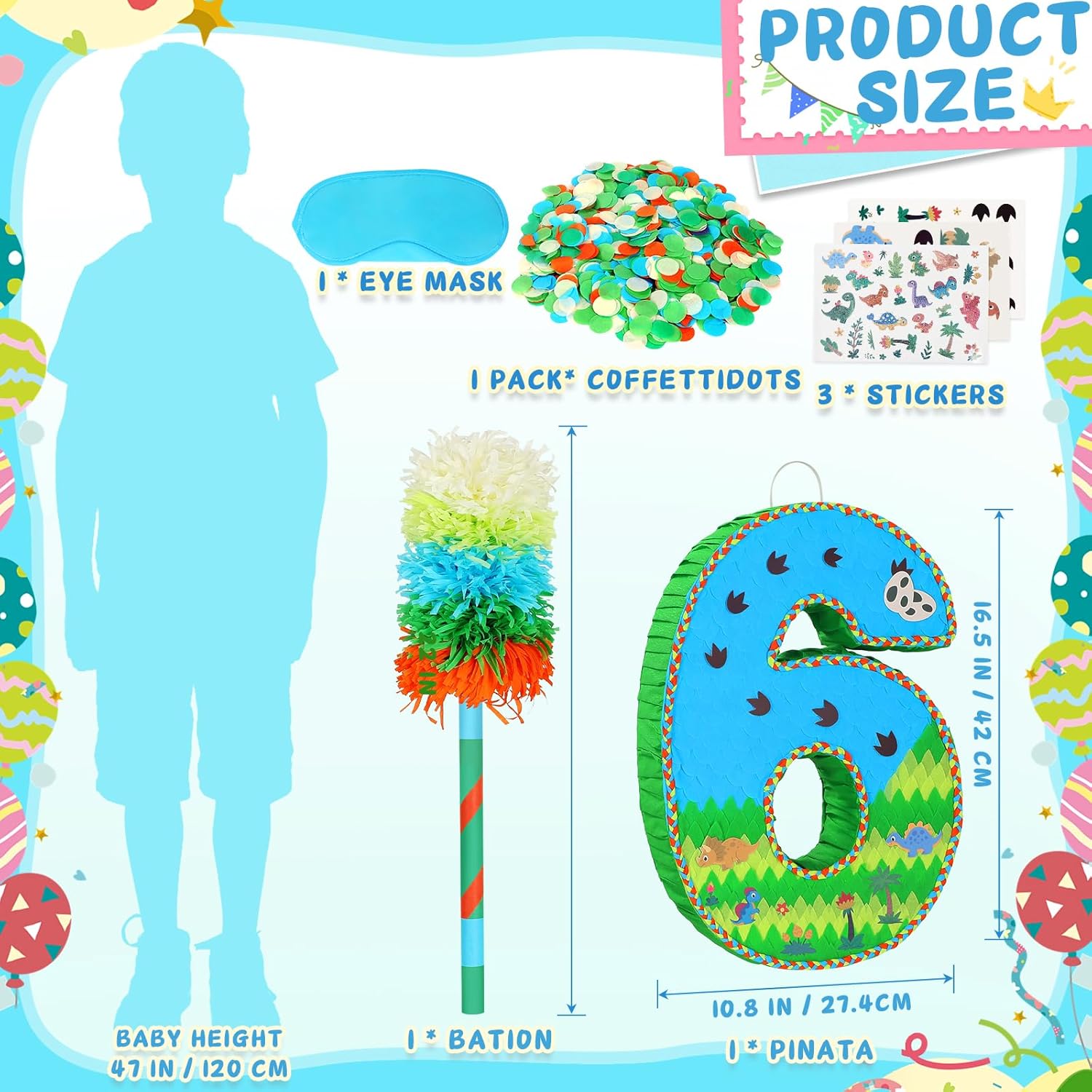 - Happy Birthday Piñata Set: Dinosaur-themed number 6 piñata, perfect for adventurous party decorations. Complete with fabric blindfold, baton, dinosaur-themed confetti and stickers