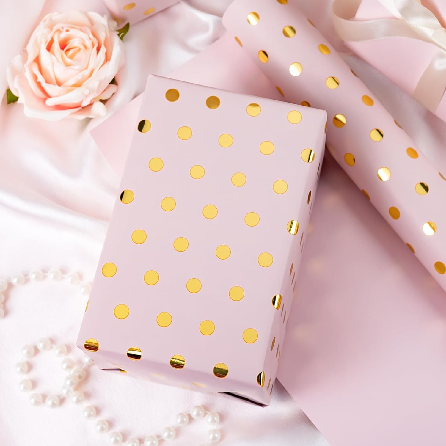 - Reversible Design: The gift wrap is the special gold foil polka dot and suitable for all kinds of packaging.One side features dazzling gold foil polka dots that catch every eye, while the reverse offers a soft, elegant pink—perfect for crafting hand-wrapped gifts that stand out.
