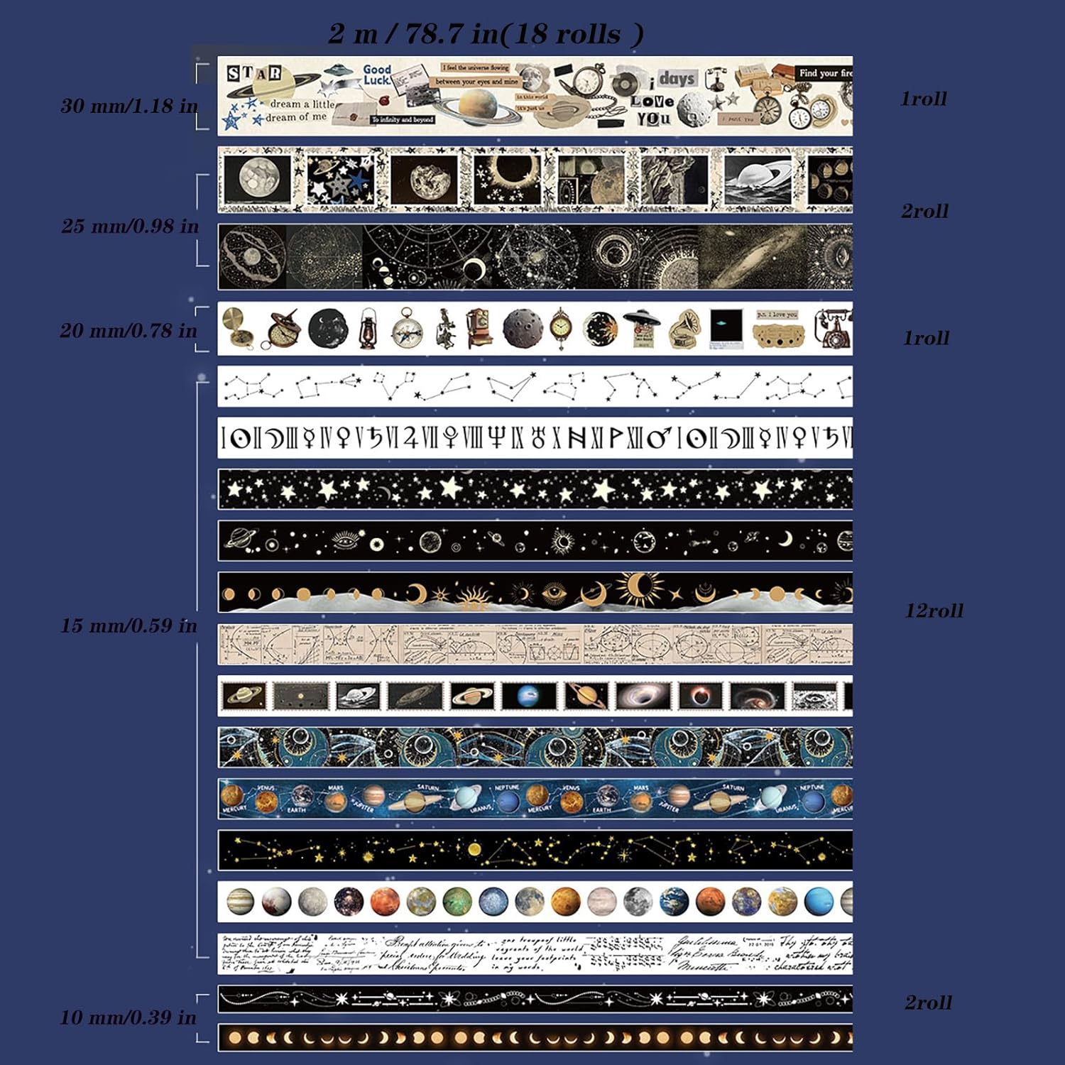 18 Rolls Celestial Washi Tape Set Galaxy washi Tape for Crafts and Journaling DIY washi Tape for journaling Decorative Tape for Scrapbook Scrapbooking Supplies