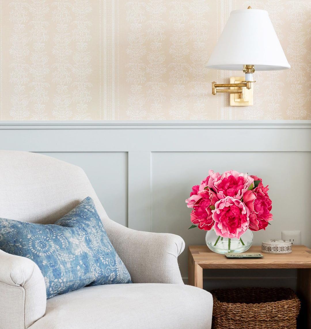 - 💐【Realistic & Elegant】Peonies artificial flowers with glass vase suits look so beautiful, unique craft design, brings different visual enjoyment to your home, create a romantic atmosphere, make you happy every day. Faux water on the vase adds to the pulchritude and realism. More realistic because of the details!