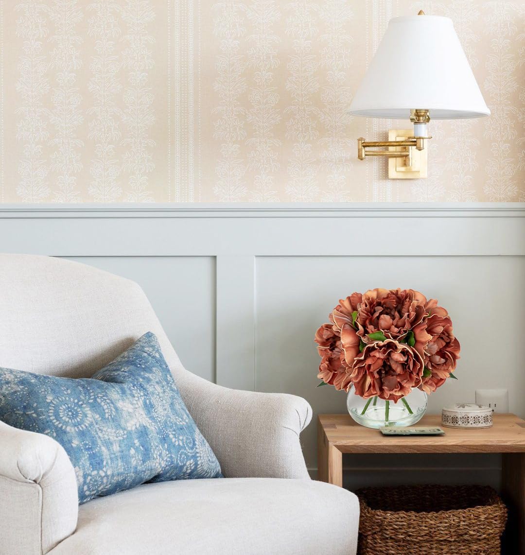 - 💐【Realistic & Elegant】Peonies artificial flowers with glass vase suits look so beautiful, unique craft design, brings different visual enjoyment to your home, create a romantic atmosphere, make you happy every day. Faux water on the vase adds to the pulchritude and realism. More realistic because of the details!