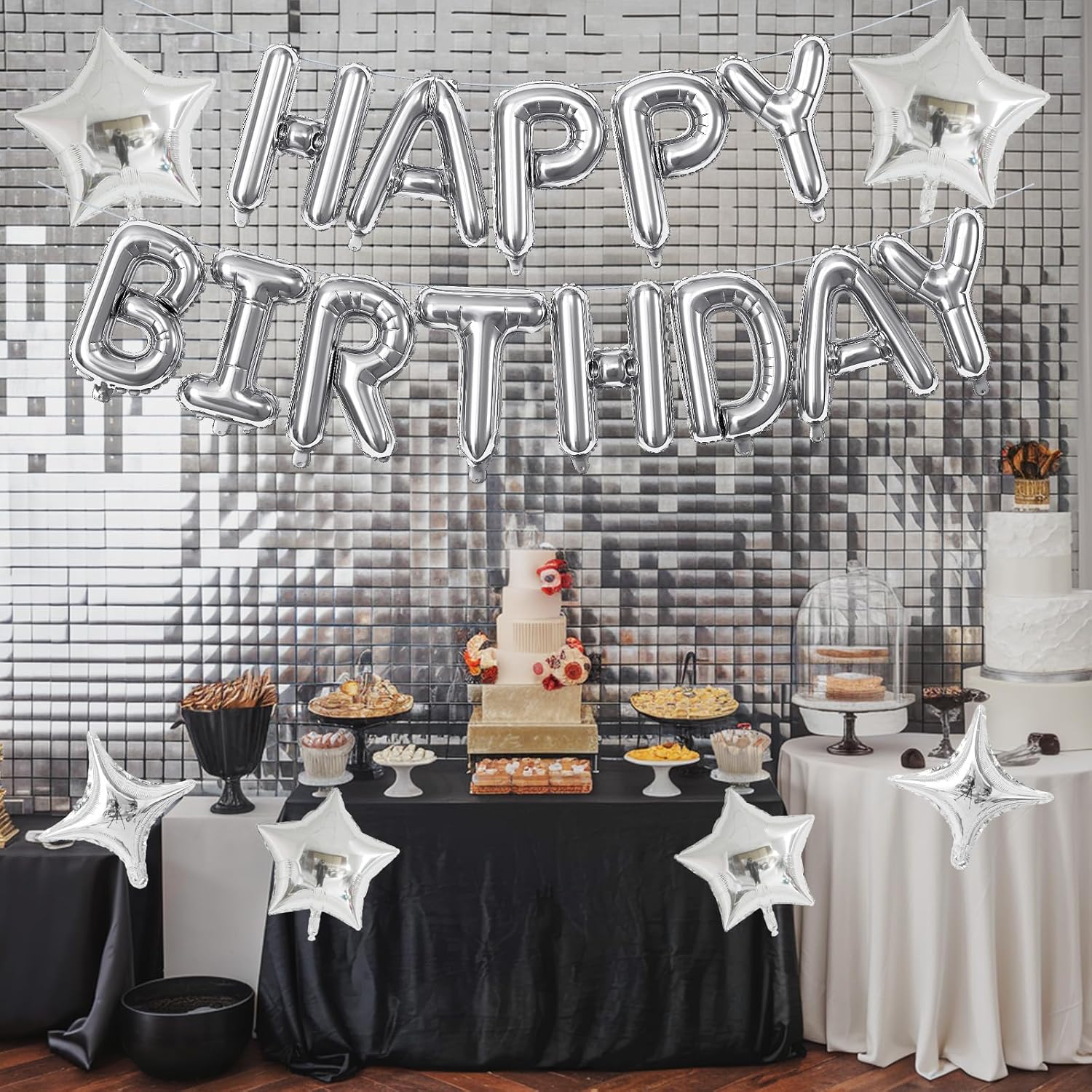 - VALUABLE PARTY DECORATION SET – Create an unforgettable birthday celebration with our Happy Birthday Balloons Banner set! Includes a 16-inch silver Mylar Foil Letter Balloons set, 4 silver star balloons, plus essential accessories like a ribbon, glue dots, and a straw for easy setup. Everything you need for a stylish and hassle-free party!