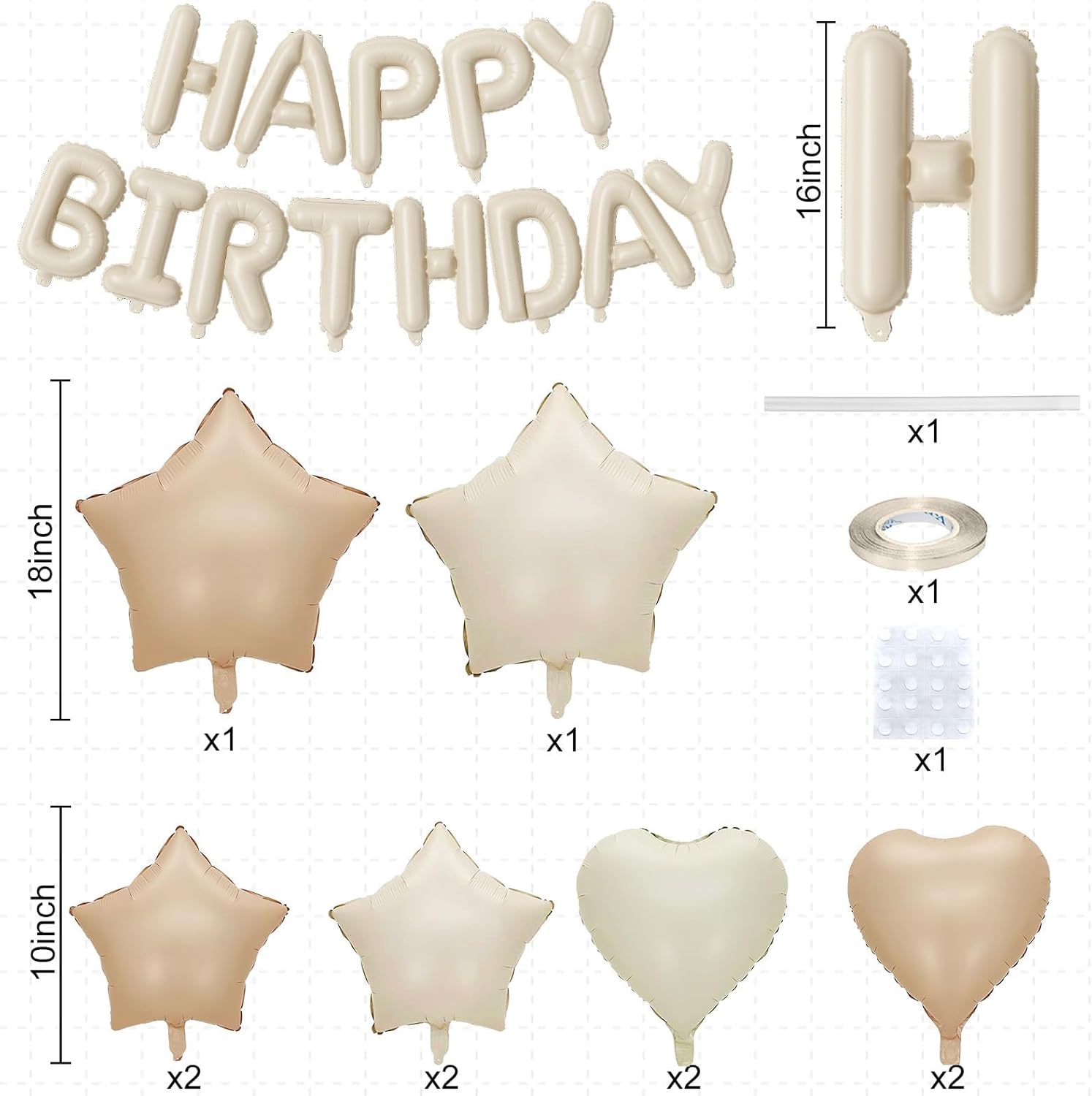 - VALUABLE PARTY DECORATION SET – Create an unforgettable birthday celebration with our Happy Birthday Balloons Banner set! Includes a 16-inch cream caramel brown Mylar Foil Letter Balloons set, 8 caramel & cream star balloons, plus essential accessories like a ribbon, glue dots, and a straw for easy setup. Everything you need for a stylish and hassle-free party!