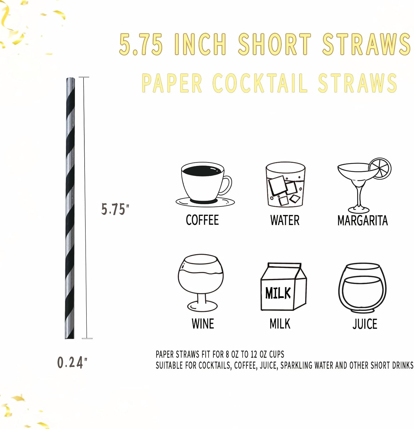 - 5.75inch Paper Straws:These straws are 5.75 inches (146 mm) long, 0.24 inches (6 mm) in diameter, and fit most standard cups (8-12 oz)