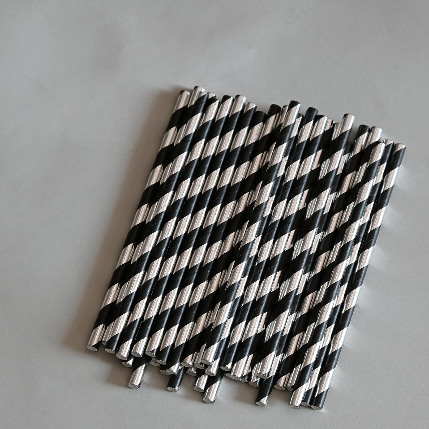 Cocktail Paper Straws - Black Silver Striped Biodegradable Disposable Drinking Straws for Brithday, Wedding, Holiday, Cake Pop Sticks - 5.75 inch