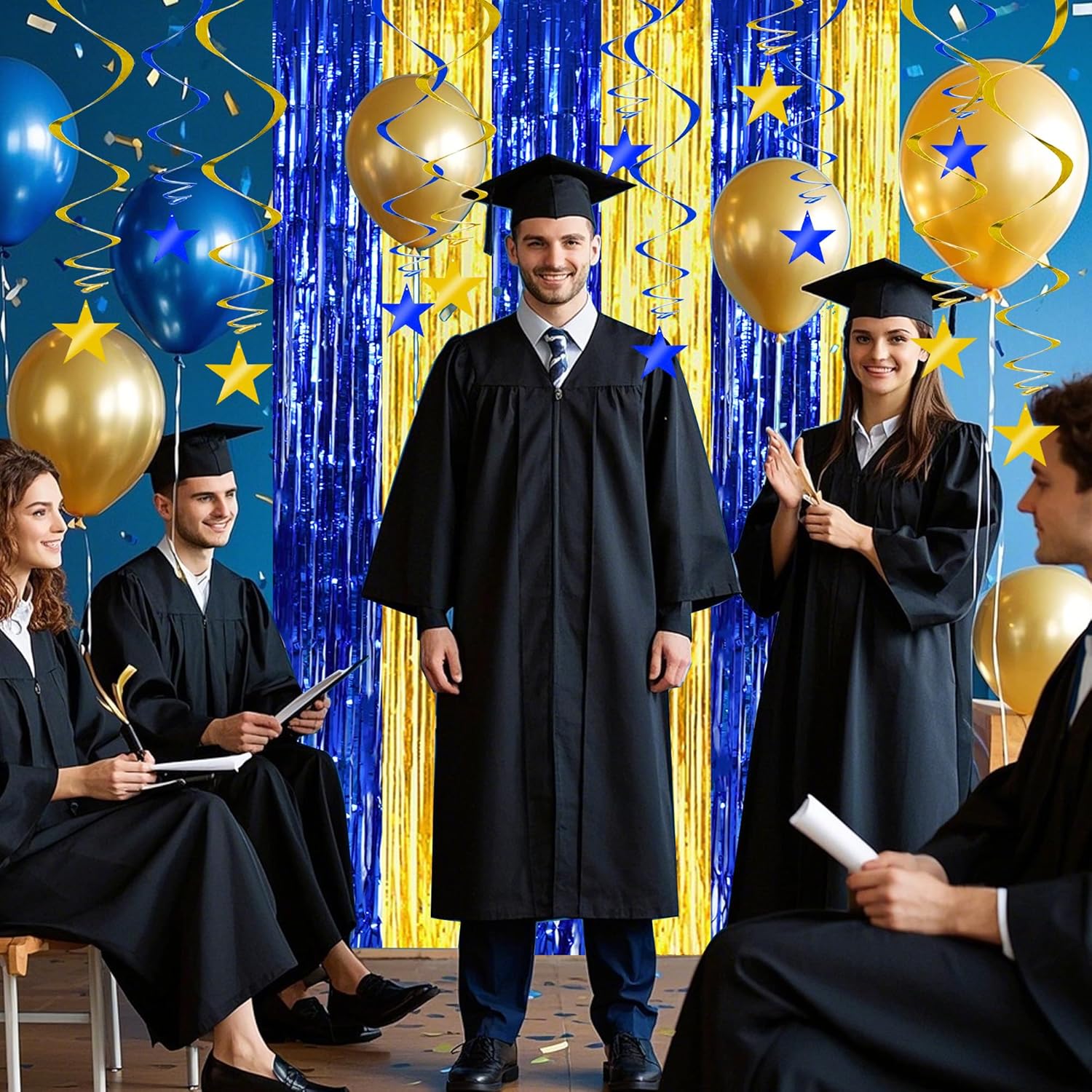 BEISHIDA Blue Gold Stars Hanging Swirls Graduation Hanging Ornament Decorations for Birthday Party Baby Shower Congrats Grade 2025 Graduation Decorations,Pack of 15