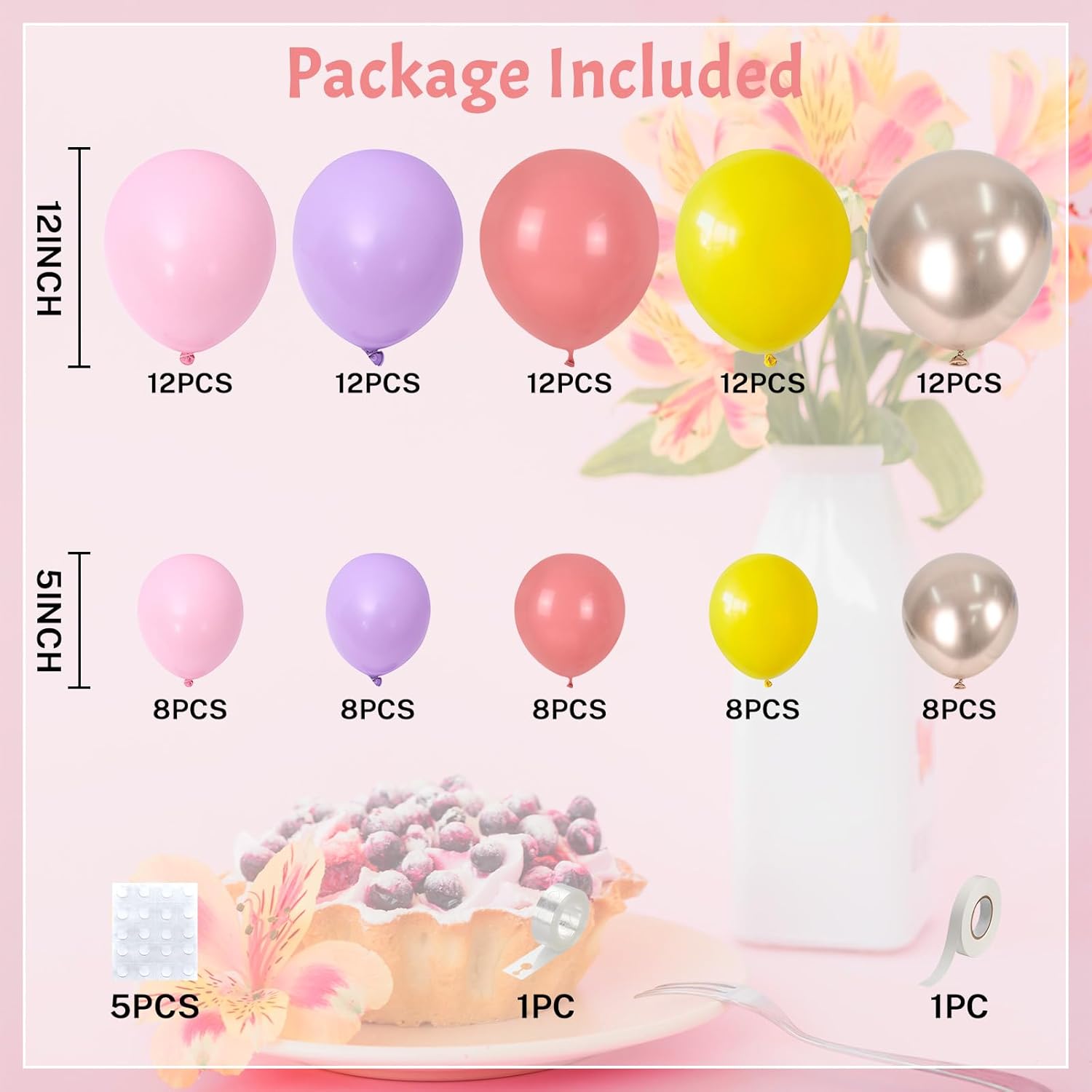 - What You Get - Fairy Pastel Pink Purple Yellow Balloon Garland Arch Kit, package including 60pcs 12 inches balloons(macaron pink*12, macaron purple*12, dusty pink*12, yellow*12, metallic champagne gold*12), 40pcs 5 inches balloons(macaron pink*8, macaron purple*8, dusty pink*8, yellow*8, metallic champagne gold*8), 1 roll of 5 meters balloon strips, 1 roll of ribbon, 5pcs dot glues. Total 107 pcs, all in one package!