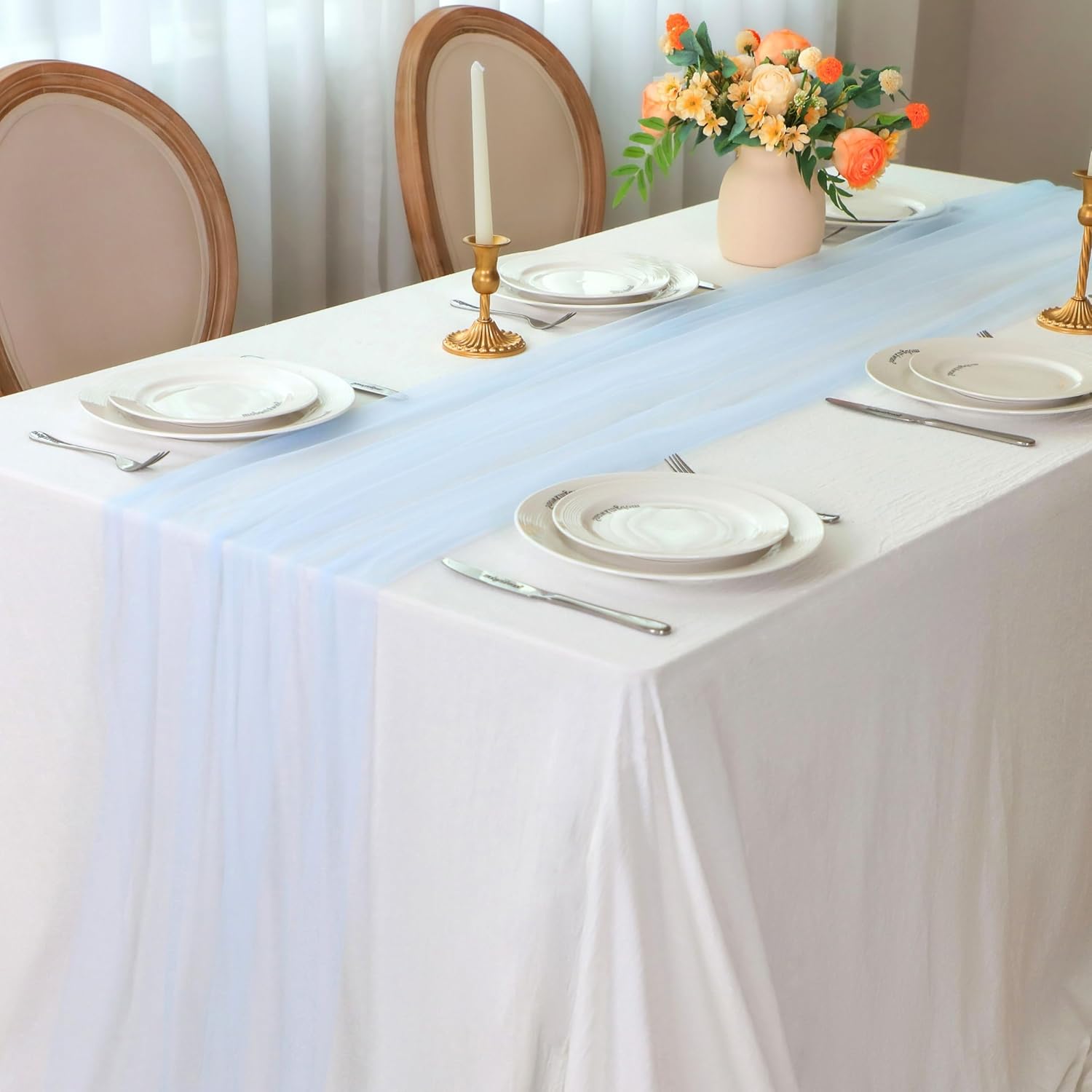 - Package: 1 Pc 27.5x120 inches light blue cheesecloth table runner, drapes a beautiful gauze curtains over your tabletop for romantic memories. Easily pairs with any holiday or party table decorations