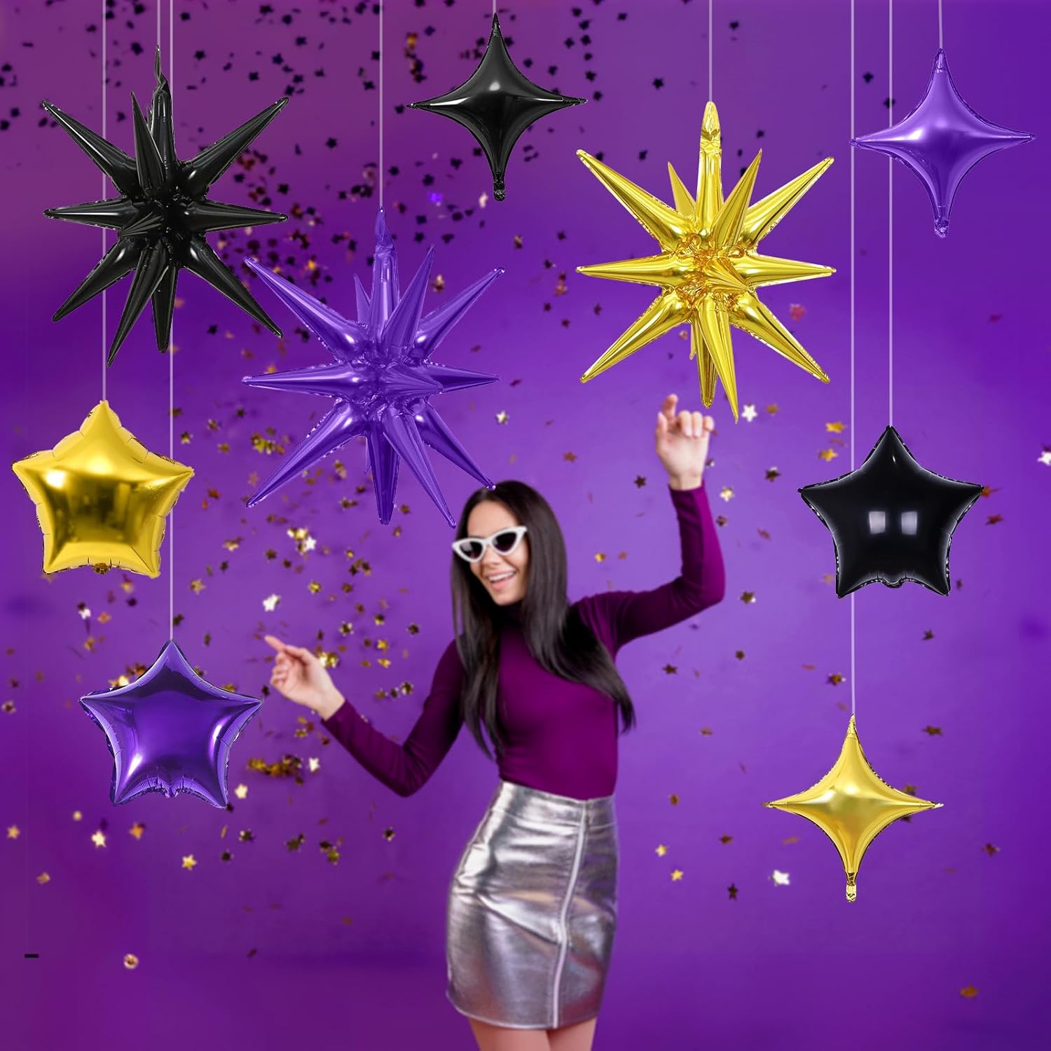 - Purple Gold Balloons Set: Package includes: purple, black, gold three-color aluminum foil star balloons (explosion stars Ă— 3, four-pointed stars Ă— 6, five-pointed stars Ă— 6) , a straw and ribbon