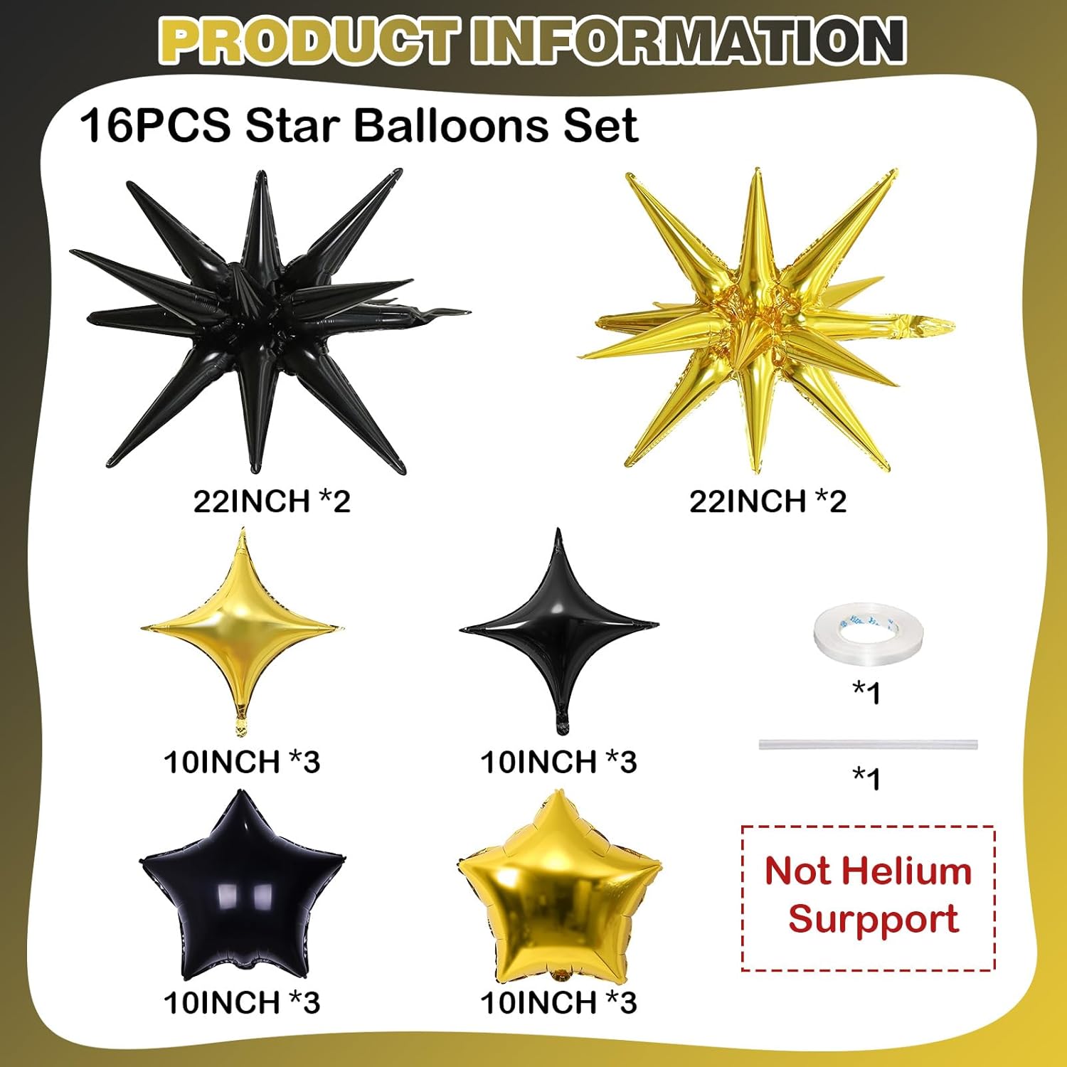 - Black Gold Balloons Set: Package includes: black, gold two-color aluminum foil star balloons (explosion stars Ă— 4, four-pointed stars Ă— 6, five-pointed stars Ă— 6) , a straw and ribbon