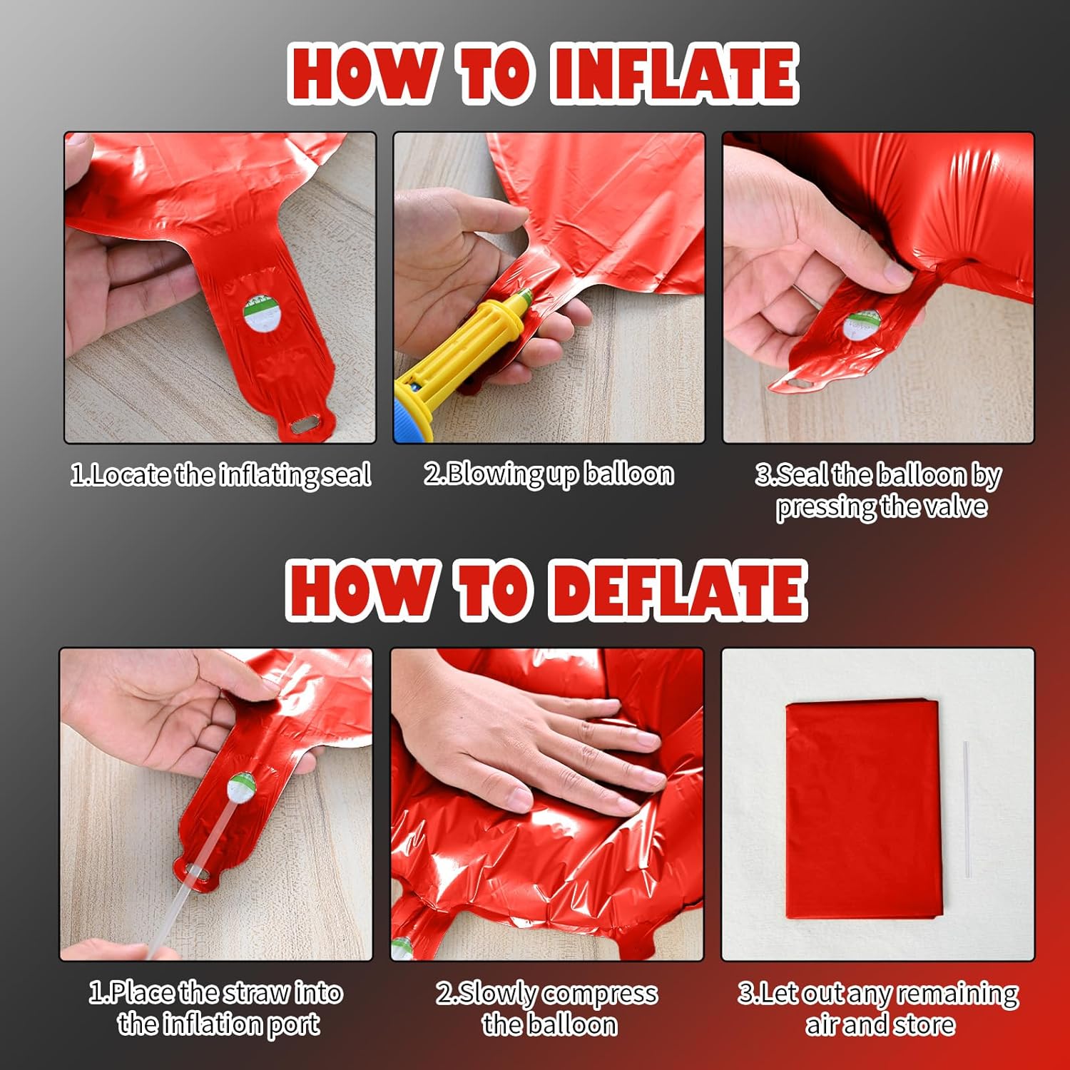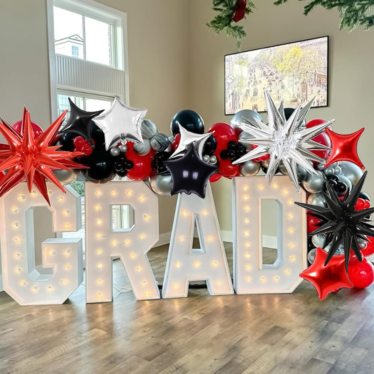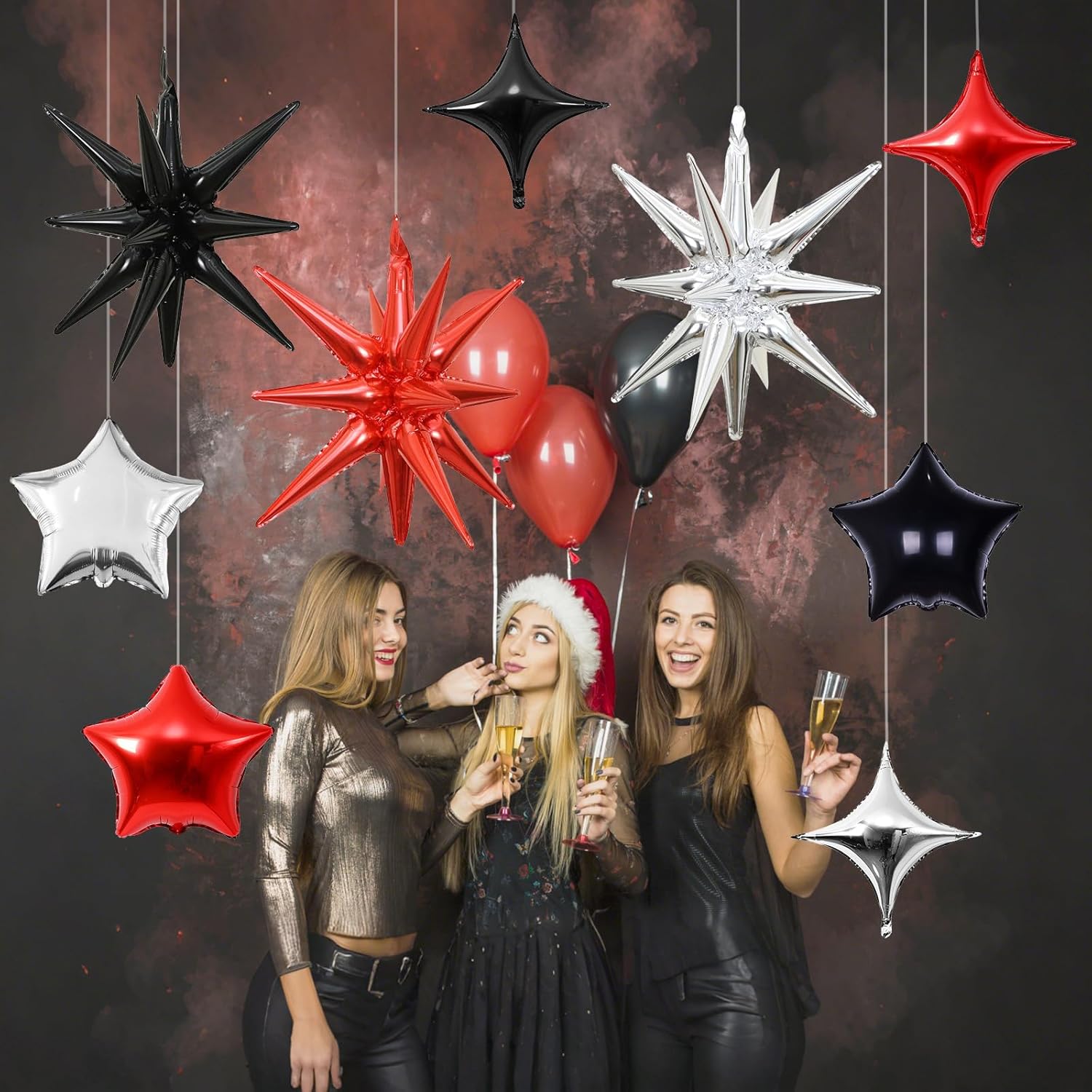- Red Black Balloons Set: Package includes: red, black, silver three-color aluminum foil star balloons (explosion stars Ă— 3, four-pointed stars Ă— 6, five-pointed stars Ă— 6) , a straw and ribbon