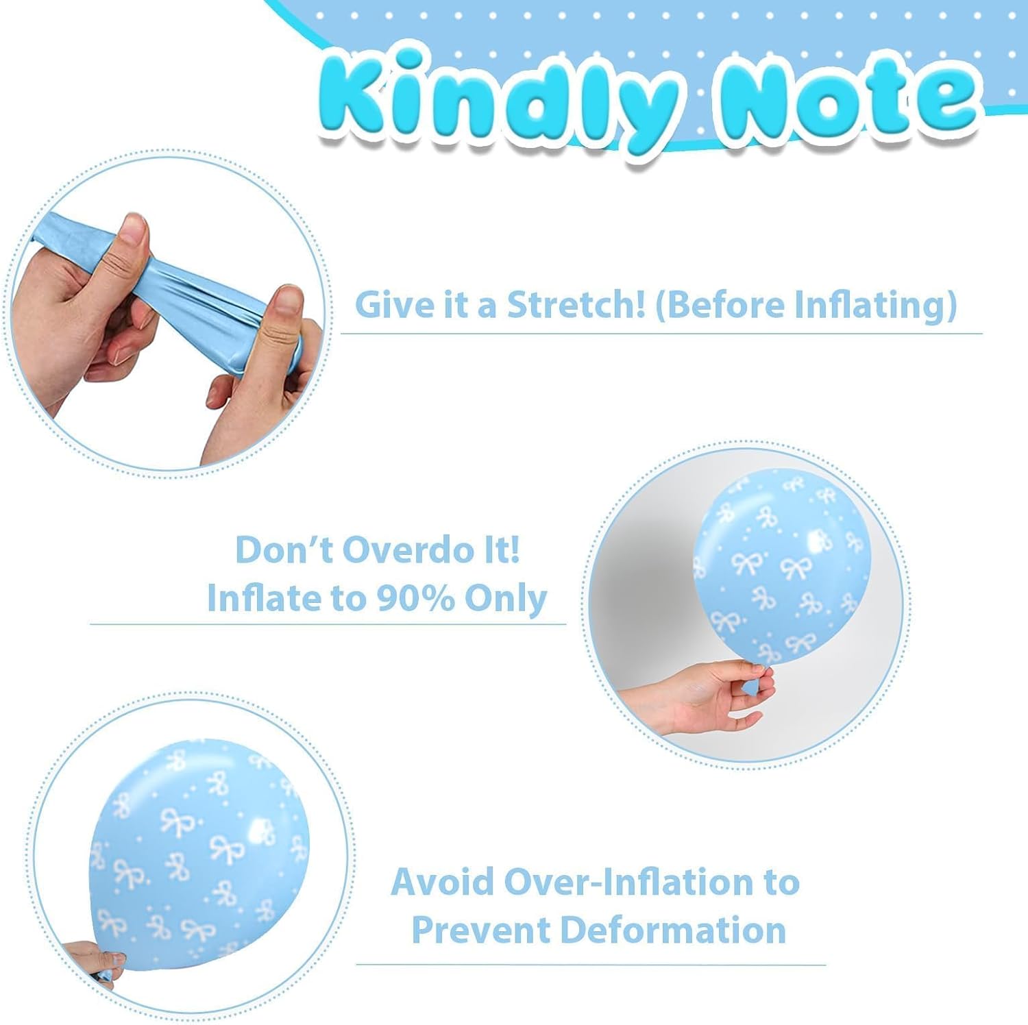 - Party-Ready Tips: Please be careful not to overfill the balloon to avoid bursting,away from sharp objects and direct sunlight to prevent damage. Please note that it is normal for 2-3 balloons out of the all to have some damage or small holes. If you have any questions or need assistance, please don't hesitate let us know.We will help you within 24 hours.