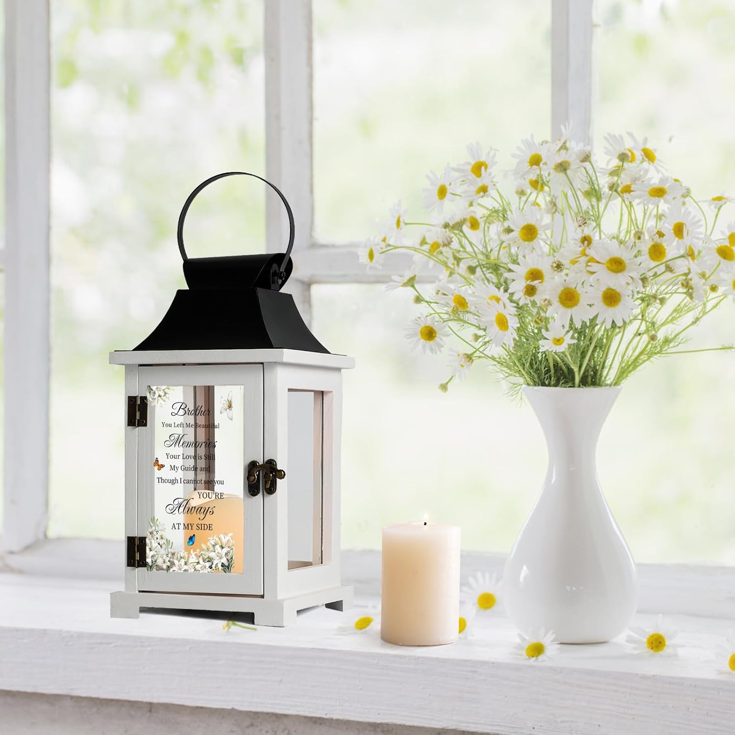 - Exquisite Design: Sympathy lanterns are made of solid wood and rust proof iron sheet, they are built to endure as a long-lasting tribute to a lost brother. The glass sides allow the candlelight to shine through clearly, adding warmth and a touch of elegance to any room. The memorial text is printed in high definition via UV printing, and the text is clear and durable. The butterfly pattern on the glass makes us feel that our brother is close by.