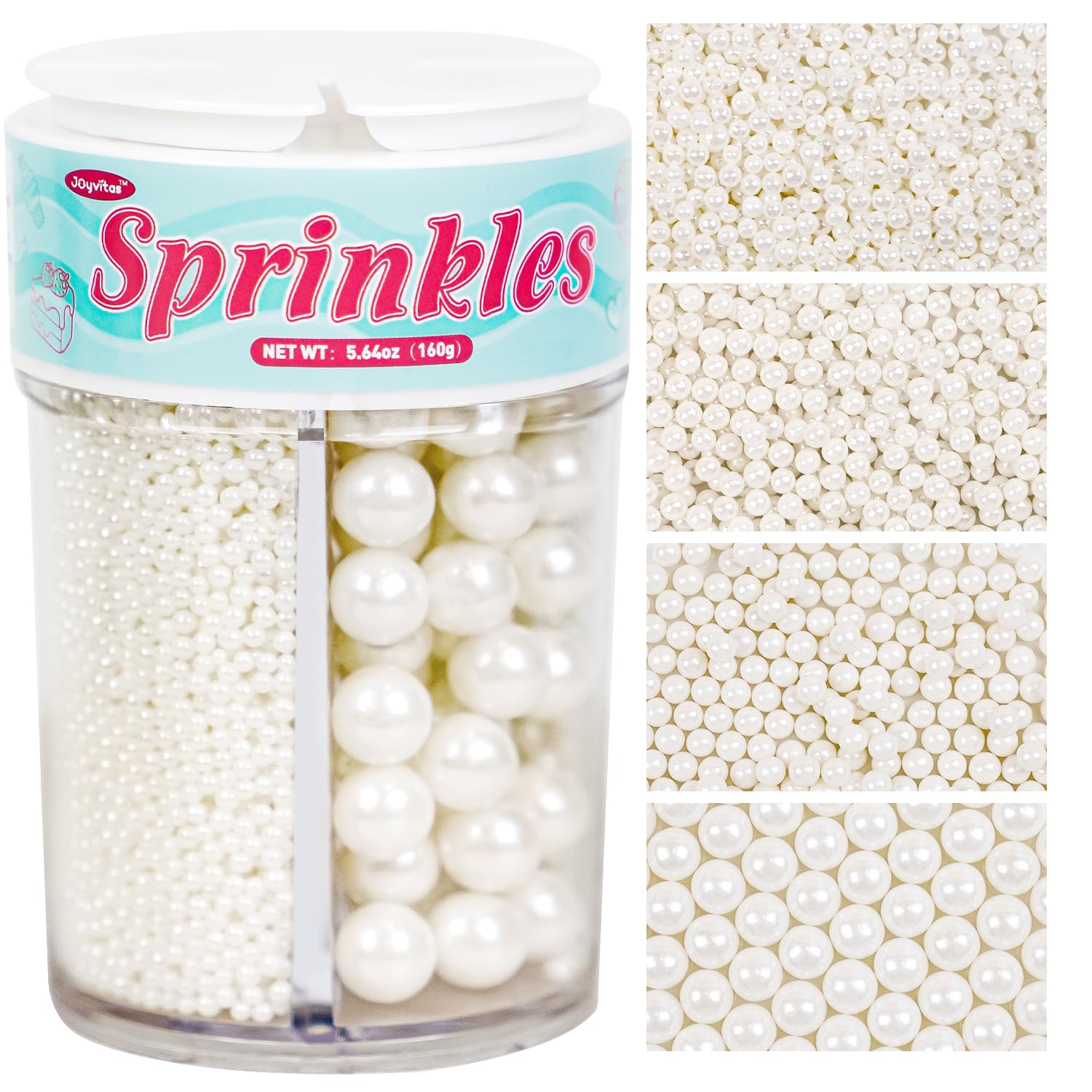 White Edible Sugar Pearl Sprinkles for Cake Decorating, Candy Pearls Sprinkles for Cupcake, Cookie, Baking Cake Decorations, 4 sizes, 160g/5.64oz, Wedding Party Chirstmas Supplies