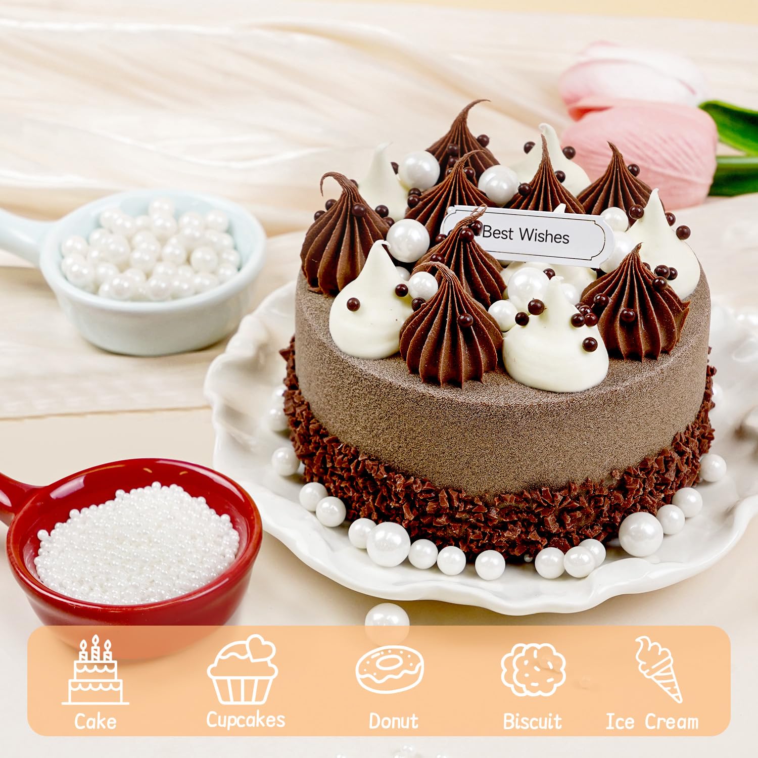- Net Weight: 150g/5.29oz. The White Pearl Sprinkles can bring an excellent decorative effect to your desserts. White Pearl Sugar can make your baking more perfect, these pearl Sprinkles can be used to decorate Cake toppers, Cupcakes, Cookies, Chocolates, Doughnuts, Ice cream and more. Each Slightly Sweet Pearl Sprinkles has a smooth and round surface and a delicate texture.