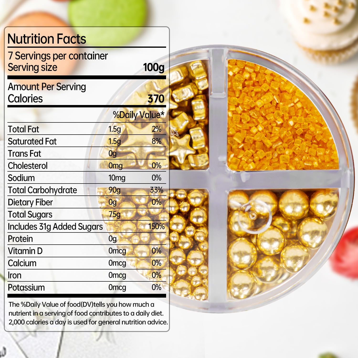 - Our Edible Gold Pearl Sprinkles are gluten-free, nut-free, preservative-free, dairy-free, and free from harmful chemicals, allowing everyone to enjoy the desserts without worry.