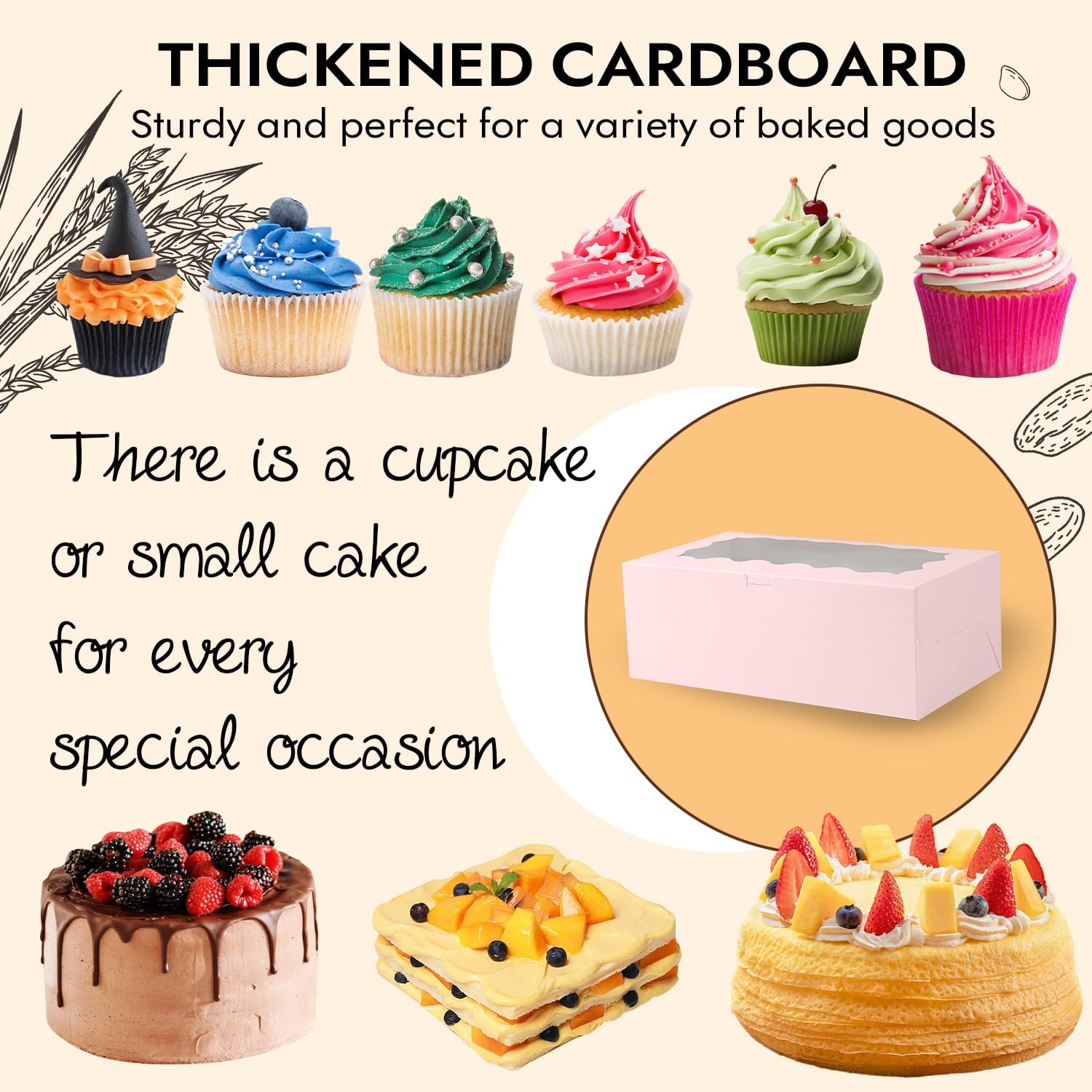 - Wide Application: the bento cake and cupcake boxes combo is not just for cakes and cupcakes, also can be applied for cookies, pies, biscuits, and other baked goods for any occasion such as a wedding, birthday, Mother's Day, baby shower, bridal shower, wedding shower, anniversary and Christmas holiday celebration.or just a take away treat with our bento cake and cupcake boxes combo.