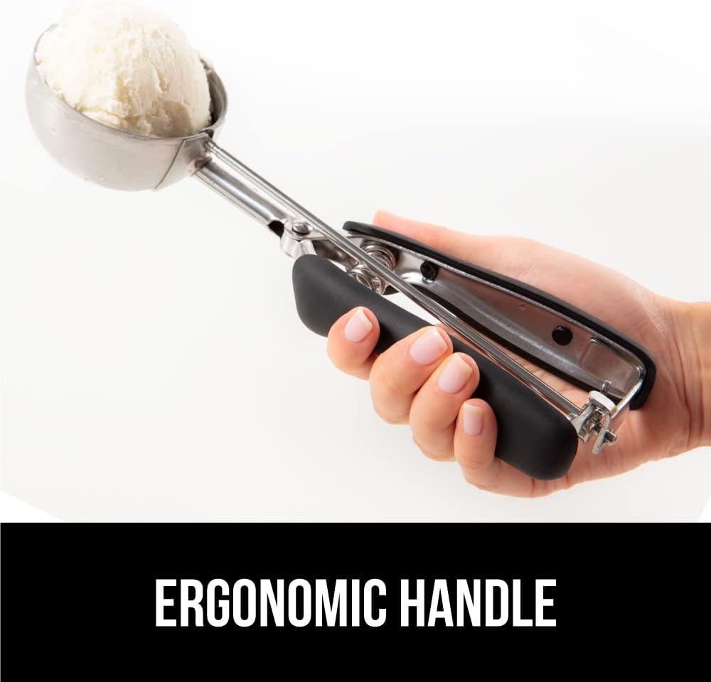 - BUILT TO LAST: constructed from solid, rust resistant, stainless steel that won’t bend or break; strong scraper helps eject stubborn and difficult ingredients out of the scoop; features an easy to press, strong spring loaded trigger action release for a smooth eject; comfortable and easy to hold ergonomic rubber handle
