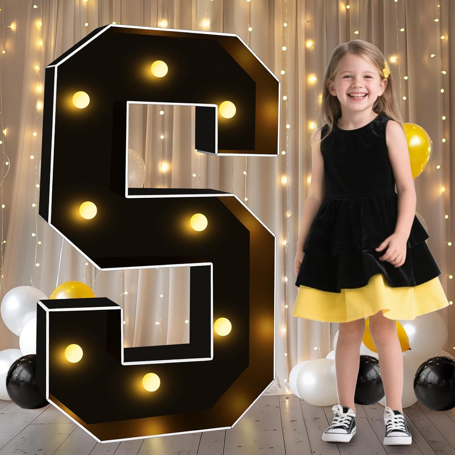 - Giant 3 Feet Marquee Letters with LED Lights: Mosaic letters designed with warm white LED string lights. Giant LED letters can be powered by 3 AA batteries (Not Included) or USB, convenient for black party decoration