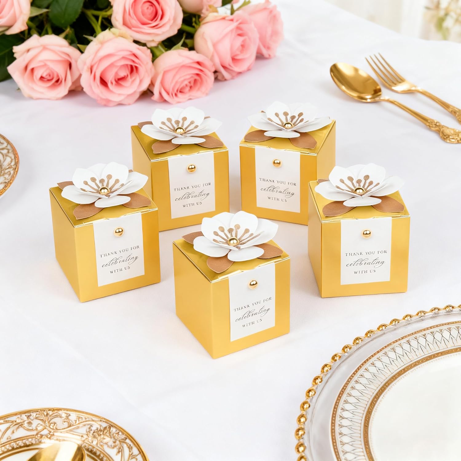 FEIYI 20 PCS Candy Boxes, 3 In 1 Gold Favor Boxes with Floral Decor, White Thank You Tags Gift wrapping for Wedding Birthday Baby Shower Decorations Party -2.55x2.55x2.55''