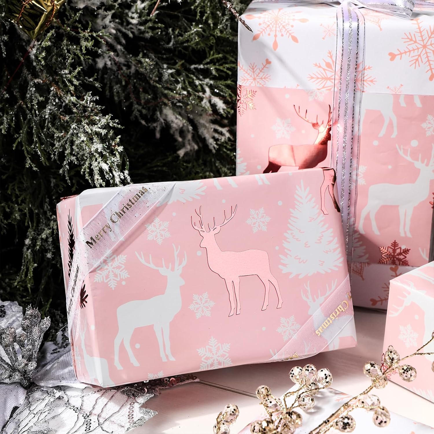 LeZakaa Christmas Pink Wrapping Paper Jumbo Roll, Reindeer & Snowflake, Metallic Foil, Rose Gold Foil Reversible Design for Festive Winter Holiday, Family Gathering, 30 inches x 100 Feet
