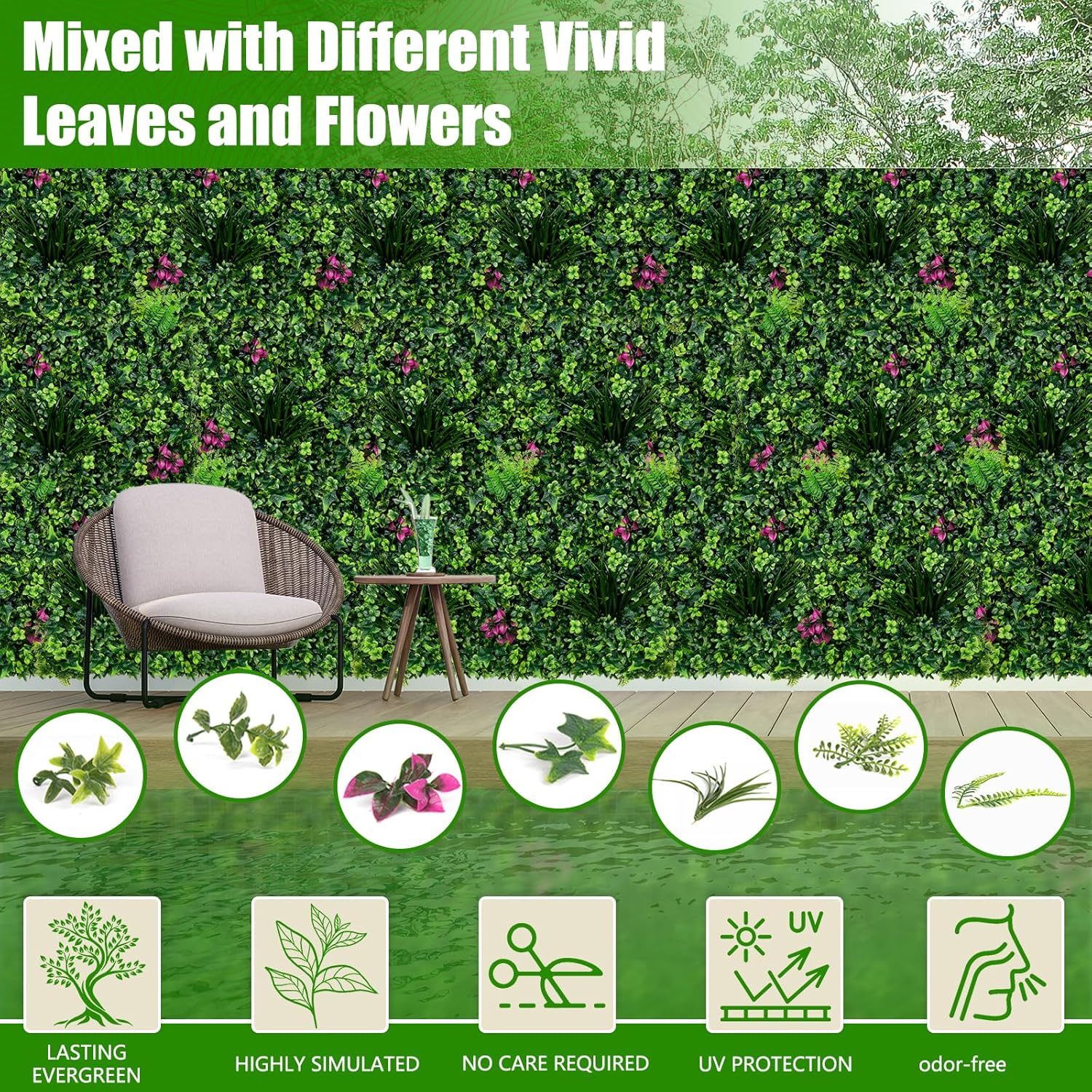 - Realistic 3D Design:Our artificial grass wall features a blend of 6 botanicals and flowering vines for a lush, multi-layered 3D effect. Each leaf is intricately designed with natural textures, color gradients, and realistic shading for an authentic look. Perfect for greenery lovers—everlasting vibrancy