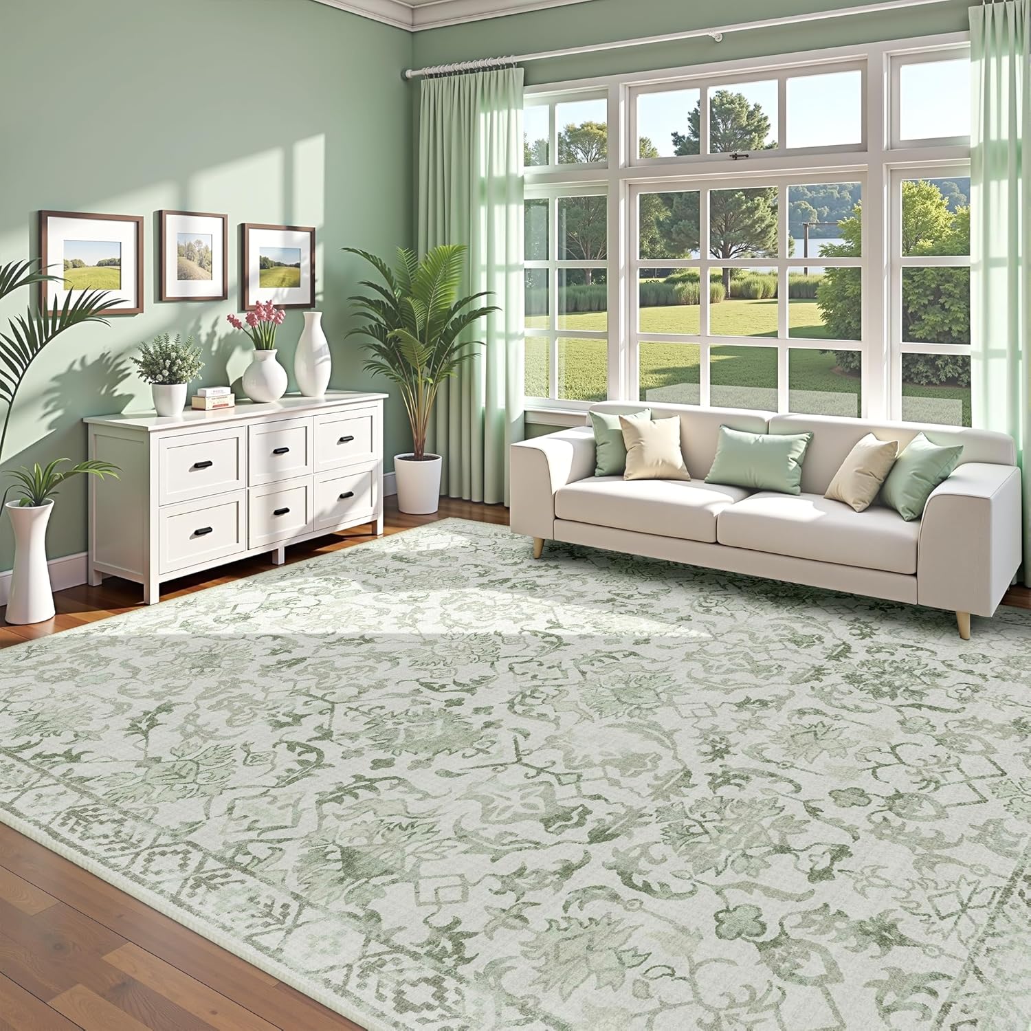 Sage Extra Large Area Rug 10x14 for Living Room, Distressed Washable Rug for Dining Room Bedroom, Anti-Slip Low-Pile and Soft Accent Rug Farmhouse Office Home Decor Light Green