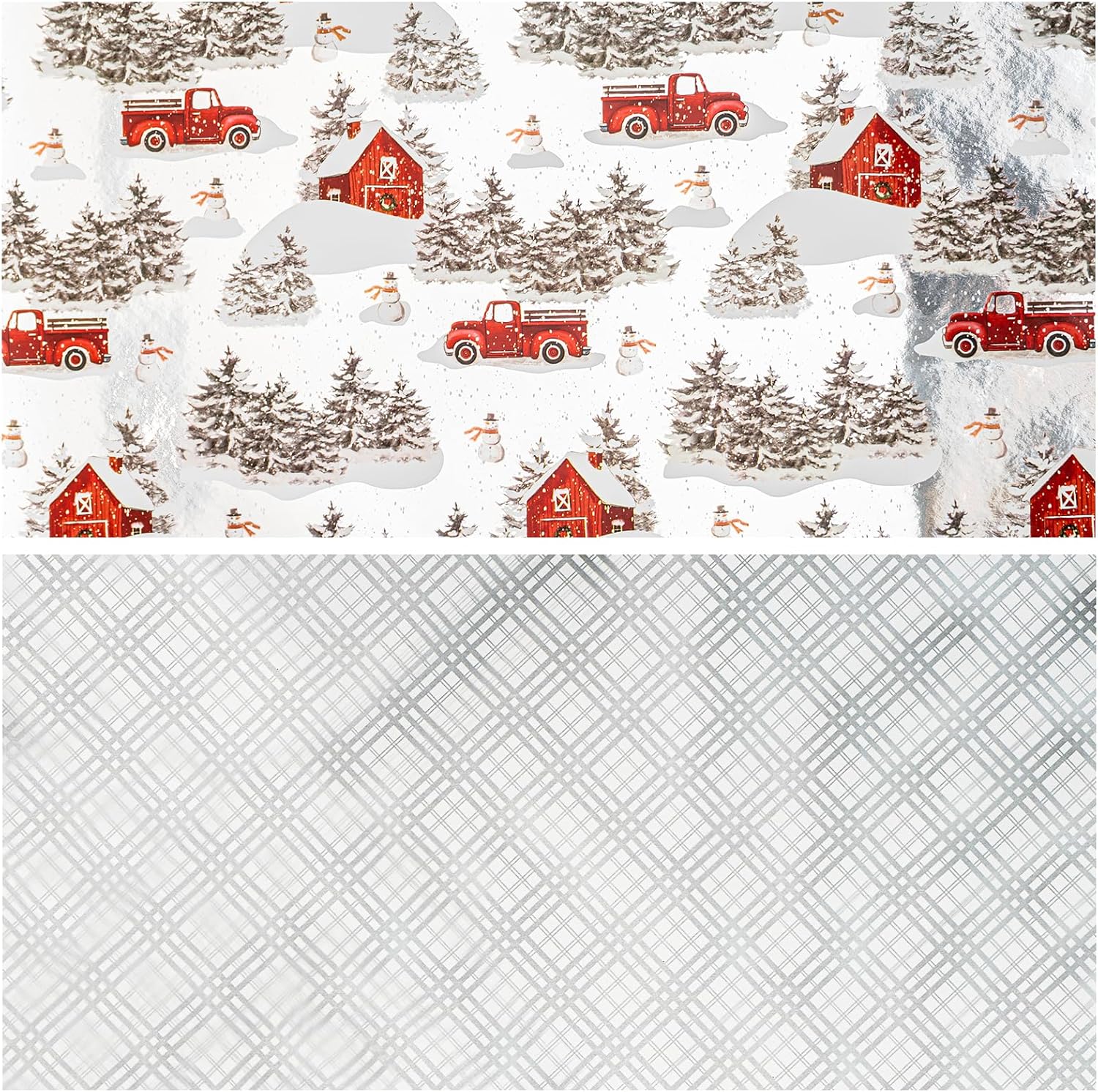 - Reversible Rustic Charm with Silver Foil: One side shows vintage red pickup trucks loaded with fir trees, snowmen, snowy barns, and frosted evergreens on a soft gray background accented with silver foil; reverse side features a silver foil laminated plaid check pattern for versatile styling.