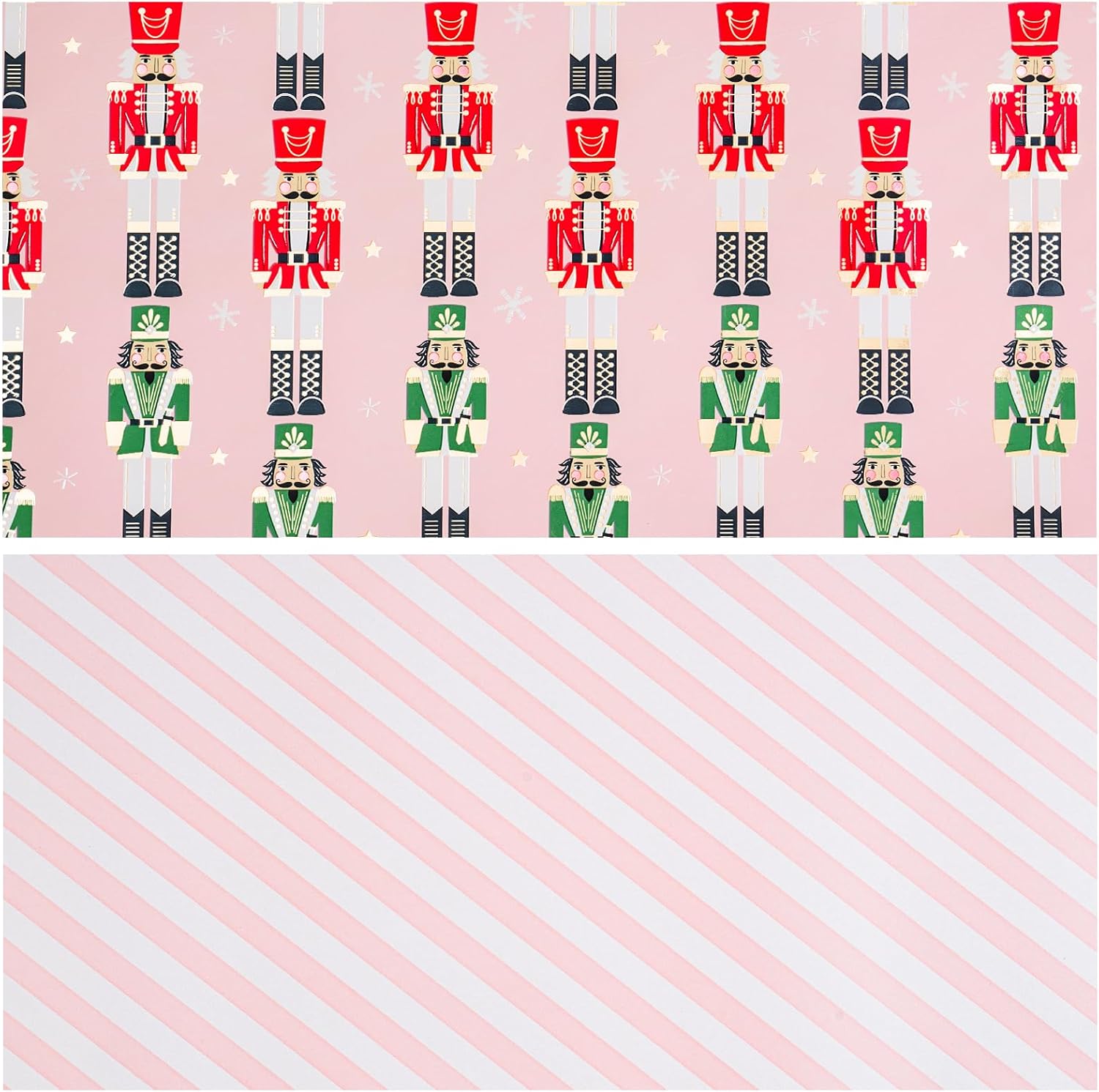 - Double-sided Festive Design: One side features nutcracker soldiers in red and green uniforms on a pink background with metallic foil accents and small star details; reverse side shows pink and white diagonal stripes for versatile looks.