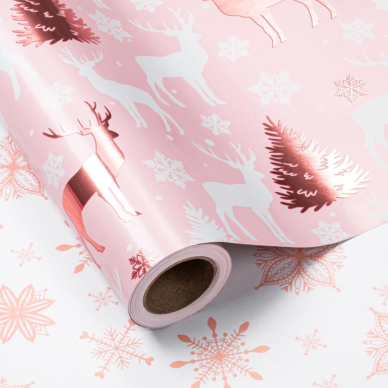 LeZakaa Christmas Pink Wrapping Paper Jumbo Roll, Reindeer & Snowflake, Metallic Foil, Rose Gold Foil Reversible Design for Festive Winter Holiday, Family Gathering, 30 inches x 32.8 Feet