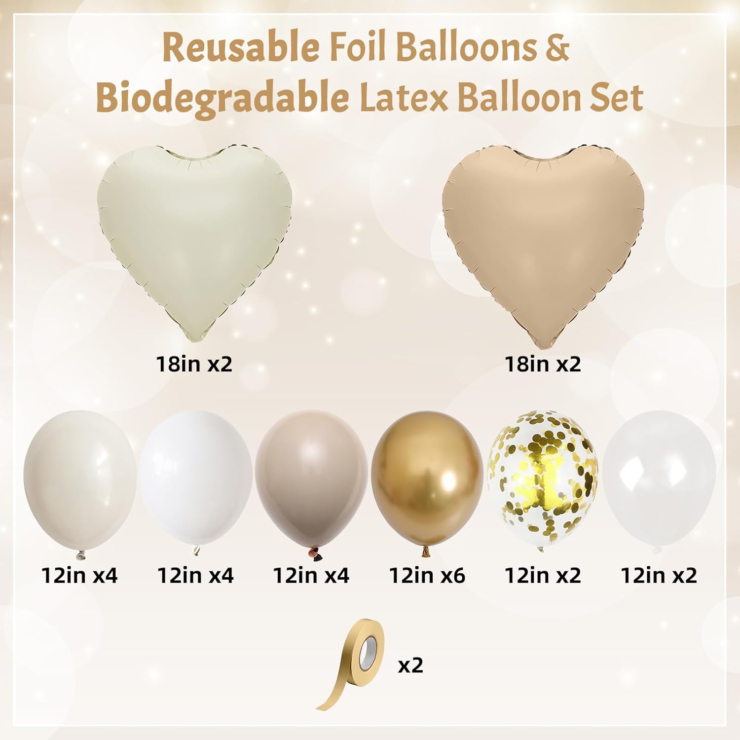 - 🥳【Heart Balloons Set - Exquisite Party Decoration】: 🤍 Cream Heart-Shaped Foil Balloons (18-in x 2), 🤎 Caramel Heart Balloons (18-in x 2), ✨ Metallic Gold Balloons (12-in x 6), ✨ Gold Confetti Balloons (12-in x 2), 🖤🤎 Apricot Double Layered Balloons (12-in x 4), ⚪ Sand White Balloons (12-in x 4), White Balloons (12-in x 4), Transparent Balloons (12-in x 2), 🎗Gold Ribbon 10M x 2. Exclusive color matching by the stylist, soft and tranquil colors.