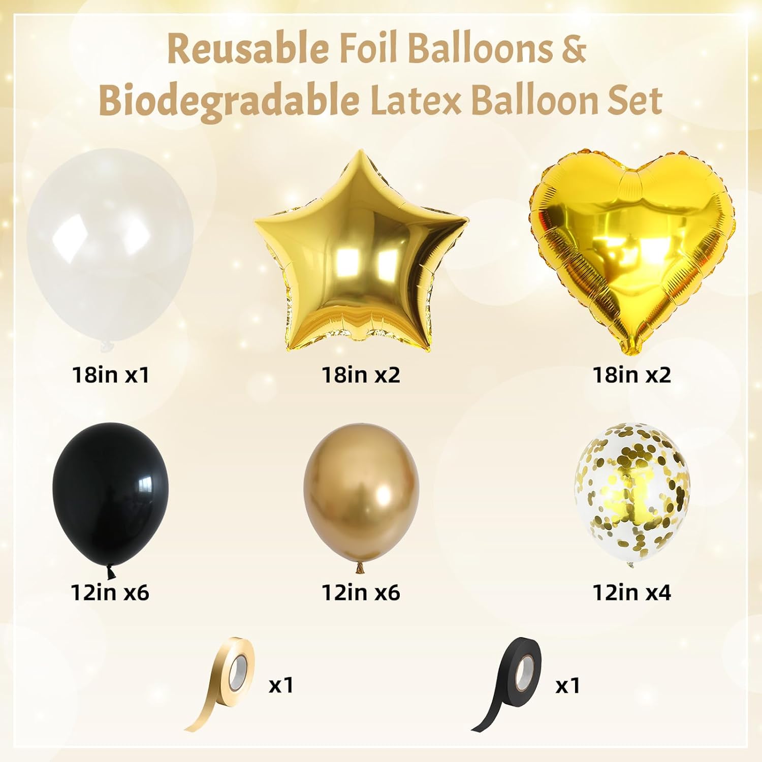 - 🥳【Heart Star Balloons Set - Exquisite&Unique Gold and Black Party Decorations】:⭐Gold Foil Star Balloons (18-inch x 2), 💛Gold Heart Shape Balloons (18-inch x 2), 💎Clear Balloon (18-inch x 1), ⚫Black Balloons (12-inch x 6), 🟡Metallic Gold Balloons (12-inch x 6), 🌟Gold Confetti Balloons (12-inch x 4), 🎗️Ribbon (Gold x 10M, Black x 10M). Exclusive color matching by the stylist, featuring vibrant and rich colors. Make your party even better